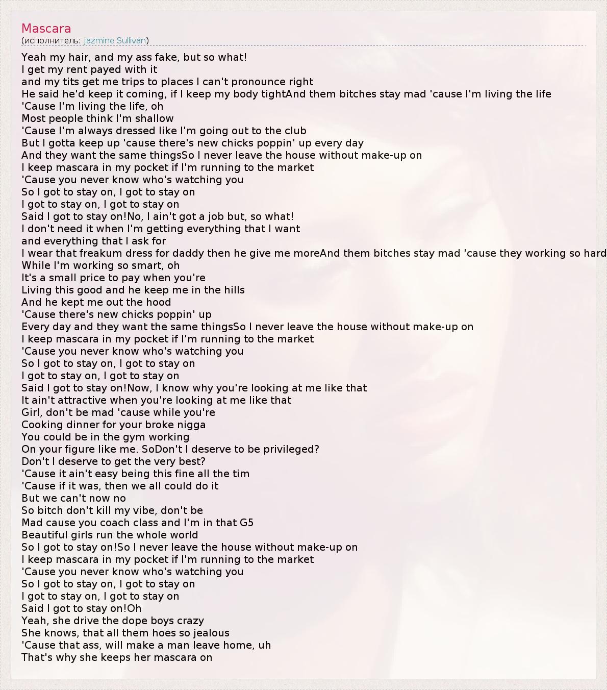 Yeah my hair, and my ass fake, but so what! I get my rent payed with it and my tits get me trips to places I can't pronounce right He said he'd keep it coming, if I keep my body tightAnd them bitches stay mad 'cause I'm living the life 'Cause I'm living the life, oh Most people think I'm shallow 'Cause I'm always dressed like I'm going out to the club But I gotta keep up 'cause there's new chicks poppin' up every day And they want the same thingsSo I never leave the house without make-up on I keep mascara in my pocket if I'm running to the market 'Cause you never know who's watching you So I got to stay on, I got to stay on I got to stay on, I got to stay on Said I got to stay on!No, I ain't got a job but, so what! I don't need it when I'm getting everything that I want and everything that I ask for I wear that freakum dress for daddy then he give me moreAnd them bitches stay mad 'cause they working so hard While I'm working so smart, oh It's a small price to pay when you're Living this good and he keep me in the hills And he kept me out the hood 'Cause there's new chicks poppin' up Every day and they want the same thingsSo I never leave the house without make-up on I keep mascara in my pocket if I'm running to the market 'Cause you never know who's watching you So I got to stay on, I got to stay on I got to stay on, I got to stay on Said I got to stay on!Now, I know why you're looking at me like that It ain't attractive when you're looking at me like that Girl, don't be mad 'cause while you're Cooking dinner for your broke nigga You could be in the gym working On your figure like me. SoDon't I deserve to be privileged? Don't I deserve to get the very best? 'Cause it ain't easy being this fine all the tim 'Cause if it was, then we all could do it But we can't now no So bitch don't kill my vibe, don't be Mad cause you coach class and I'm in that G5 Beautiful girls run the whole world So I got to stay on!So I never leave the house without make-up on I keep mascara in my pocket if I'm running to the market 'Cause you never know who's watching you So I got to stay on, I got to stay on I got to stay on, I got to stay on Said I got to stay on!Oh Yeah, she drive the dope boys crazy She knows, that all them hoes so jealous 'Cause that ass, will make a man leave home, uh That's why she keeps her mascara on
