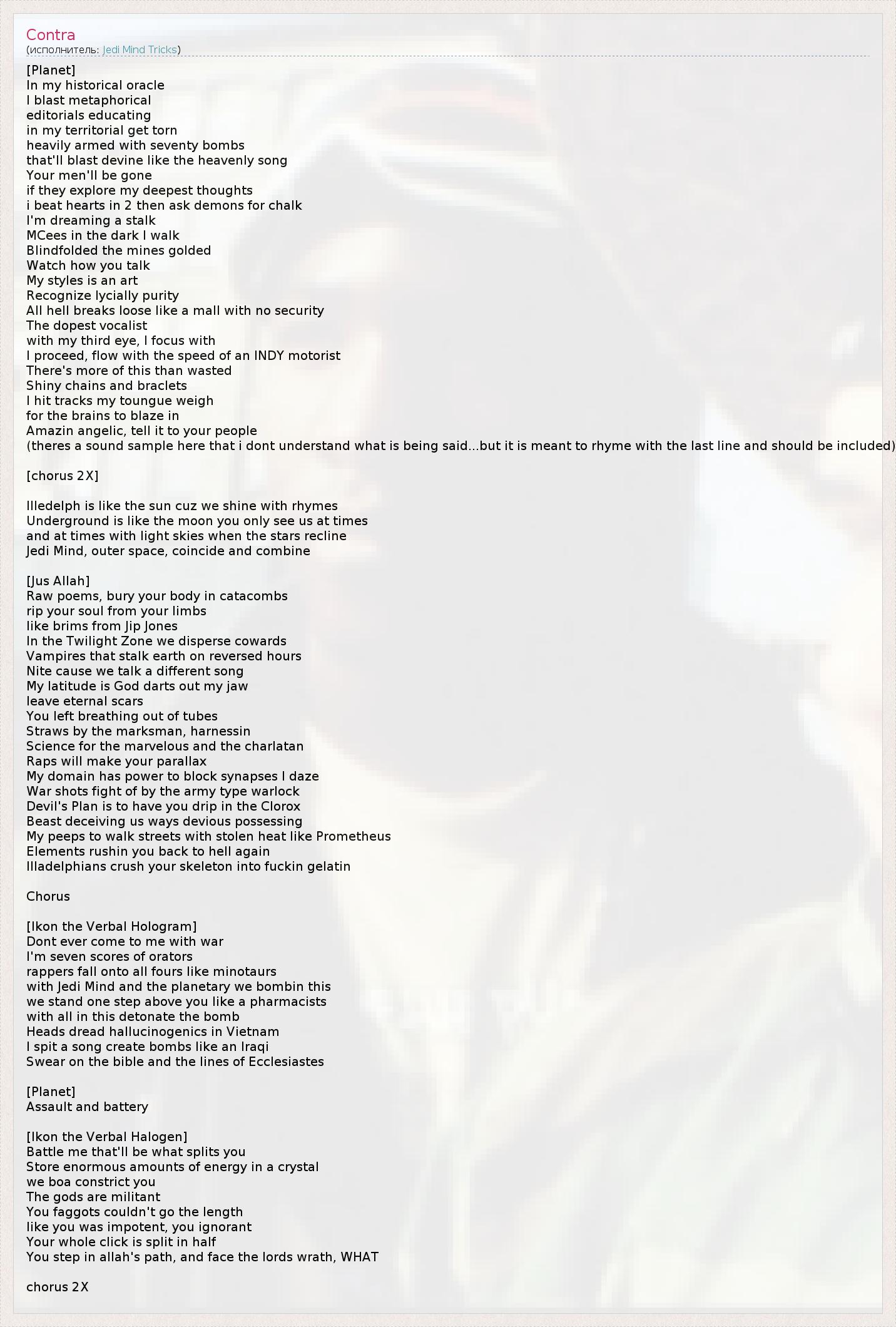 Это интересно:Jedi Mind Tricks (JMT) — американская хип-хоп-андерграунд группа. Была основана двумя школьными приятелями Vinnie Paz’ом (Винчензо Лювинери)и Stoupe the Enemy of Mankind’ом(Кевин Бэлдвин). В 1999 году, в коллектив пришел рэпер из Нью-Джерси Jus Allah (Джеймс Бостик). Он принял участие в записи второго студийного альбома — Violent by Design , после чего покинул группу по неизвестной причине. Позже, на треке «The Rebuilding»(2006) состоялось... продолжение