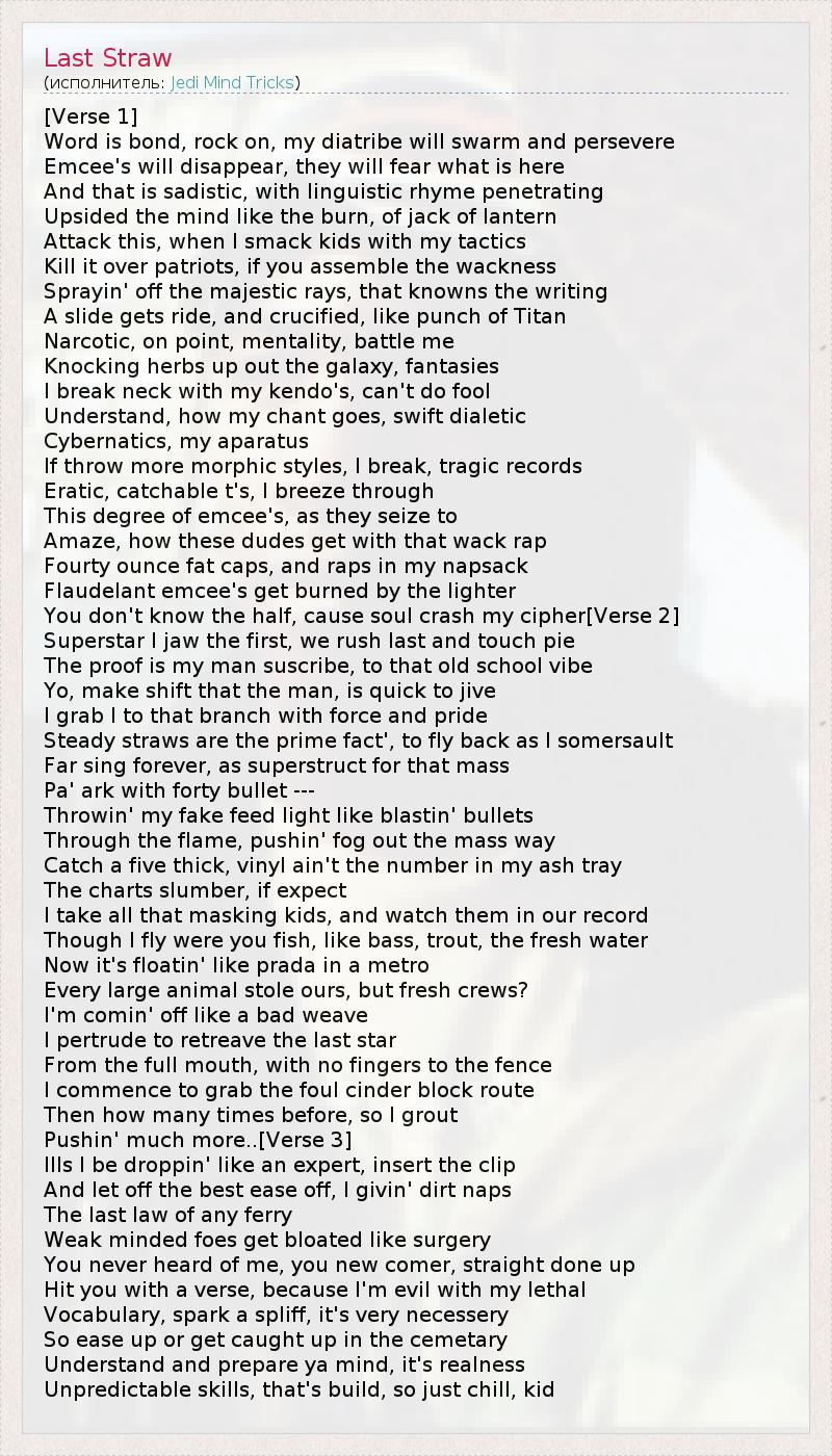 [Verse 1] Word is bond, rock on, my diatribe will swarm and persevere Emcee's will disappear, they will fear what is here And that is sadistic, with linguistic rhyme penetrating Upsided the mind like the burn, of jack of lantern Attack this, when I smack kids with my tactics Kill it over patriots, if you assemble the wackness Sprayin' off the majestic rays, that knowns the writing A slide gets ride, and crucified, like punch of Titan Narcotic, on point, mentality, battle me Knocking herbs up out the galaxy, fantasies I break neck with my kendo's, can't do fool Understand, how my chant goes, swift dialetic Cybernatics, my aparatus If throw more morphic styles, I break, tragic records Eratic, catchable t's, I breeze through This degree of emcee's, as they seize to Amaze, how these dudes get with that wack rap Fourty ounce fat caps, and raps in my napsack Flaudelant emcee's get burned by the lighter You don't know the half, cause soul crash my cipher[Verse 2] Superstar I jaw the first, we rush last and touch pie The proof is my man suscribe, to that old school vibe Yo, make shift that the man, is quick to jive I grab I to that branch with force and pride Steady straws are the prime fact', to fly back as I somersault Far sing forever, as superstruct for that mass Pa' ark with forty bullet --- Throwin' my fake feed light like blastin' bullets Through the flame, pushin' fog out the mass way Catch a five thick, vinyl ain't the number in my ash tray The charts slumber, if expect I take all that masking kids, and watch them in our record Though I fly were you fish, like bass, trout, the fresh water Now it's floatin' like prada in a metro Every large animal stole ours, but fresh crews? I'm comin' off like a bad weave I pertrude to retreave the last star From the full mouth, with no fingers to the fence I commence to grab the foul cinder block route Then how many times before, so I grout Pushin' much more..[Verse 3] Ills I be droppin' like an expert, insert the clip And let off the best ease off, I givin' dirt naps The last law of any ferry Weak minded foes get bloated like surgery You never heard of me, you new comer, straight done up Hit you with a verse, because I'm evil with my lethal Vocabulary, spark a spliff, it's very necessery So ease up or get caught up in the cemetary Understand and prepare ya mind, it's realness Unpredictable skills, that's build, so just chill, kid