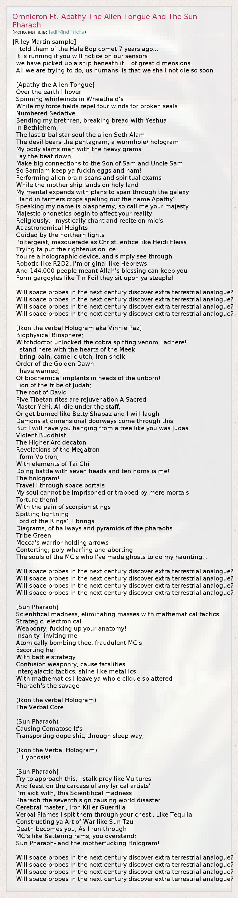 А как ты думаешь, о чем песня "Omnicron Ft. Apathy The Alien Tongue And The Sun Pharaoh" ?