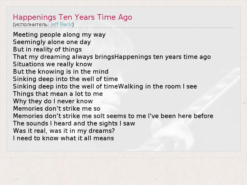 А как ты думаешь, о чем песня "Happenings Ten Years Time Ago" ?