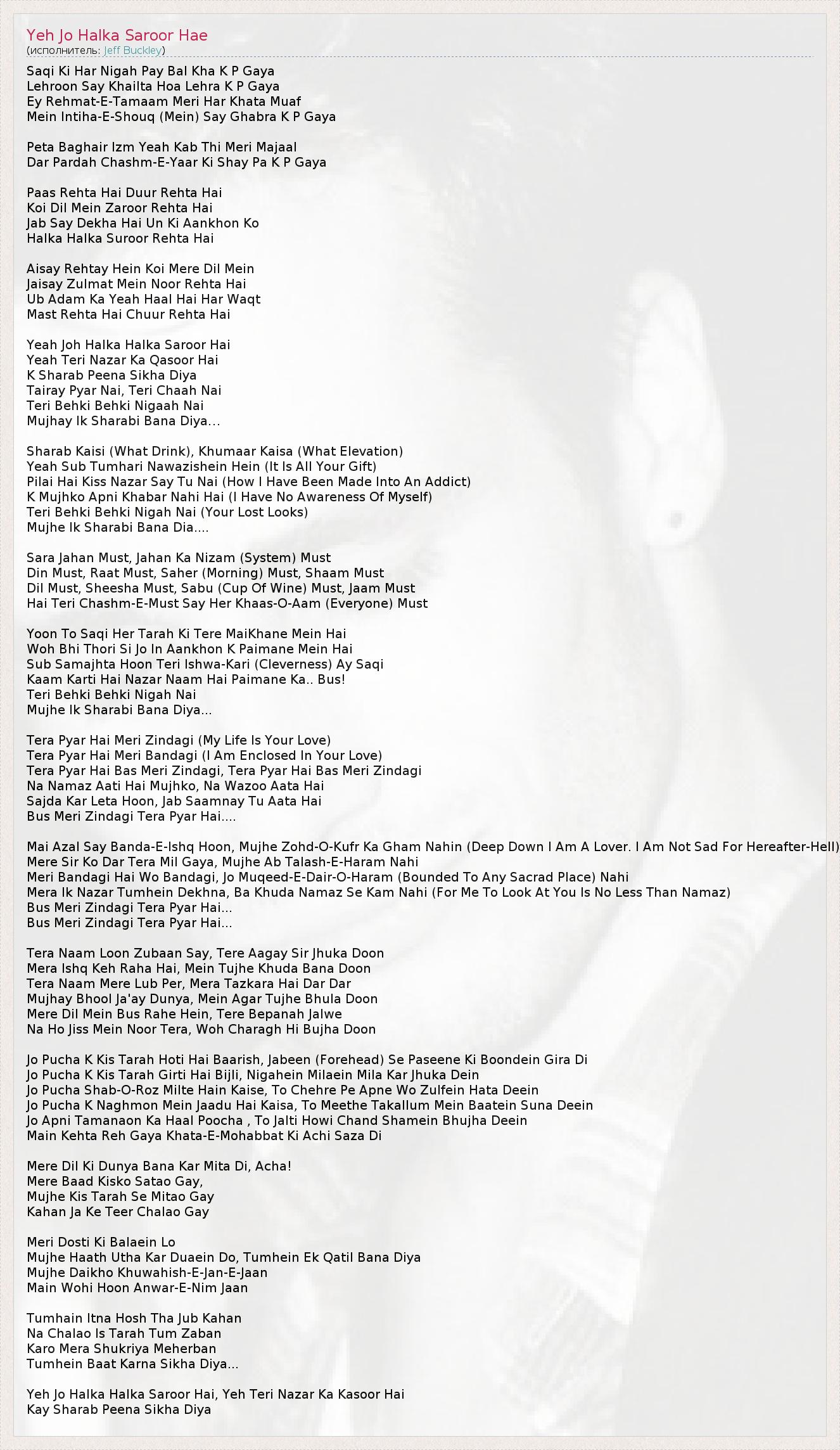 Saqi Ki Har Nigah Pay Bal Kha K P Gaya Lehroon Say Khailta Hoa Lehra K P Gaya Ey Rehmat-E-Tamaam Meri Har Khata Muaf Mein Intiha-E-Shouq (Mein) Say Ghabra K P Gaya Peta Baghair Izm Yeah Kab Thi Meri Majaal Dar Pardah Chashm-E-Yaar Ki Shay Pa K P Gaya Paas Rehta Hai Duur Rehta Hai Koi Dil Mein Zaroor Rehta Hai Jab Say Dekha Hai Un Ki Aankhon Ko Halka Halka Suroor Rehta Hai Aisay Rehtay Hein Koi Mere Dil Mein Jaisay Zulmat Mein Noor Rehta Hai Ub Adam Ka Yeah Haal Hai Har Waqt Mast Rehta Hai Chuur Rehta Hai Yeah Joh Halka Halka Saroor Hai Yeah Teri Nazar Ka Qasoor Hai K Sharab Peena Sikha Diya Tairay Pyar Nai, Teri Chaah Nai Teri Behki Behki Nigaah Nai Mujhay Ik Sharabi Bana Diya… Sharab Kaisi (What Drink), Khumaar Kaisa (What Elevation) Yeah Sub Tumhari Nawazishein Hein (It Is All Your Gift) Pilai Hai Kiss Nazar Say Tu Nai (How I Have Been Made Into An Addict) K Mujhko Apni Khabar Nahi Hai (I Have No Awareness Of Myself) Teri Behki Behki Nigah Nai (Your Lost Looks) Mujhe Ik Sharabi Bana Dia.... Sara Jahan Must, Jahan Ka Nizam (System) Must Din Must, Raat Must, Saher (Morning) Must, Shaam Must Dil Must, Sheesha Must, Sabu (Cup Of Wine) Must, Jaam Must Hai Teri Chashm-E-Must Say Her Khaas-O-Aam (Everyone) Must Yoon To Saqi Her Tarah Ki Tere MaiKhane Mein Hai Woh Bhi Thori Si Jo In Aankhon K Paimane Mein Hai Sub Samajhta Hoon Teri Ishwa-Kari (Cleverness) Ay Saqi Kaam Karti Hai Nazar Naam Hai Paimane Ka.. Bus! Teri Behki Behki Nigah Nai Mujhe Ik Sharabi Bana Diya... Tera Pyar Hai Meri Zindagi (My Life Is Your Love) Tera Pyar Hai Meri Bandagi (I Am Enclosed In Your Love) Tera Pyar Hai Bas Meri Zindagi, Tera Pyar Hai Bas Meri Zindagi Na Namaz Aati Hai Mujhko, Na Wazoo Aata Hai Sajda Kar Leta Hoon, Jab Saamnay Tu Aata Hai Bus Meri Zindagi Tera Pyar Hai.... Mai Azal Say Banda-E-Ishq Hoon, Mujhe Zohd-O-Kufr Ka Gham Nahin (Deep Down I Am A Lover. I Am Not Sad For Hereafter-Hell) Mere Sir Ko Dar Tera Mil Gaya, Mujhe Ab Talash-E-Haram Nahi Meri Bandagi Hai Wo Bandagi, Jo Muqeed-E-Dair-O-Haram (Bounded To Any Sacrad Place) Nahi Mera Ik Nazar Tumhein Dekhna, Ba Khuda Namaz Se Kam Nahi (For Me To Look At You Is No Less Than Namaz) Bus Meri Zindagi Tera Pyar Hai... Bus Meri Zindagi Tera Pyar Hai... Tera Naam Loon Zubaan Say, Tere Aagay Sir Jhuka Doon Mera Ishq Keh Raha Hai, Mein Tujhe Khuda Bana Doon Tera Naam Mere Lub Per, Mera Tazkara Hai Dar Dar Mujhay Bhool Ja'ay Dunya, Mein Agar Tujhe Bhula Doon Mere Dil Mein Bus Rahe Hein, Tere Bepanah Jalwe Na Ho Jiss Mein Noor Tera, Woh Charagh Hi Bujha Doon Jo Pucha K Kis Tarah Hoti Hai Baarish, Jabeen (Forehead) Se Paseene Ki Boondein Gira Di Jo Pucha K Kis Tarah Girti Hai Bijli, Nigahein Milaein Mila Kar Jhuka Dein Jo Pucha Shab-O-Roz Milte Hain Kaise, To Chehre Pe Apne Wo Zulfein Hata Deein Jo Pucha K Naghmon Mein Jaadu Hai Kaisa, To Meethe Takallum Mein Baatein Suna Deein Jo Apni Tamanaon Ka Haal Poocha , To Jalti Howi Chand Shamein Bhujha Deein Main Kehta Reh Gaya Khata-E-Mohabbat Ki Achi Saza Di Mere Dil Ki Dunya Bana Kar Mita Di, Acha! Mere Baad Kisko Satao Gay, Mujhe Kis Tarah Se Mitao Gay Kahan Ja Ke Teer Chalao Gay Meri Dosti Ki Balaein Lo Mujhe Haath Utha Kar Duaein Do, Tumhein Ek Qatil Bana Diya Mujhe Daikho Khuwahish-E-Jan-E-Jaan Main Wohi Hoon Anwar-E-Nim Jaan Tumhain Itna Hosh Tha Jub Kahan Na Chalao Is Tarah Tum Zaban Karo Mera Shukriya Meherban Tumhein Baat Karna Sikha Diya... Yeh Jo Halka Halka Saroor Hai, Yeh Teri Nazar Ka Kasoor Hai Kay Sharab Peena Sikha Diya