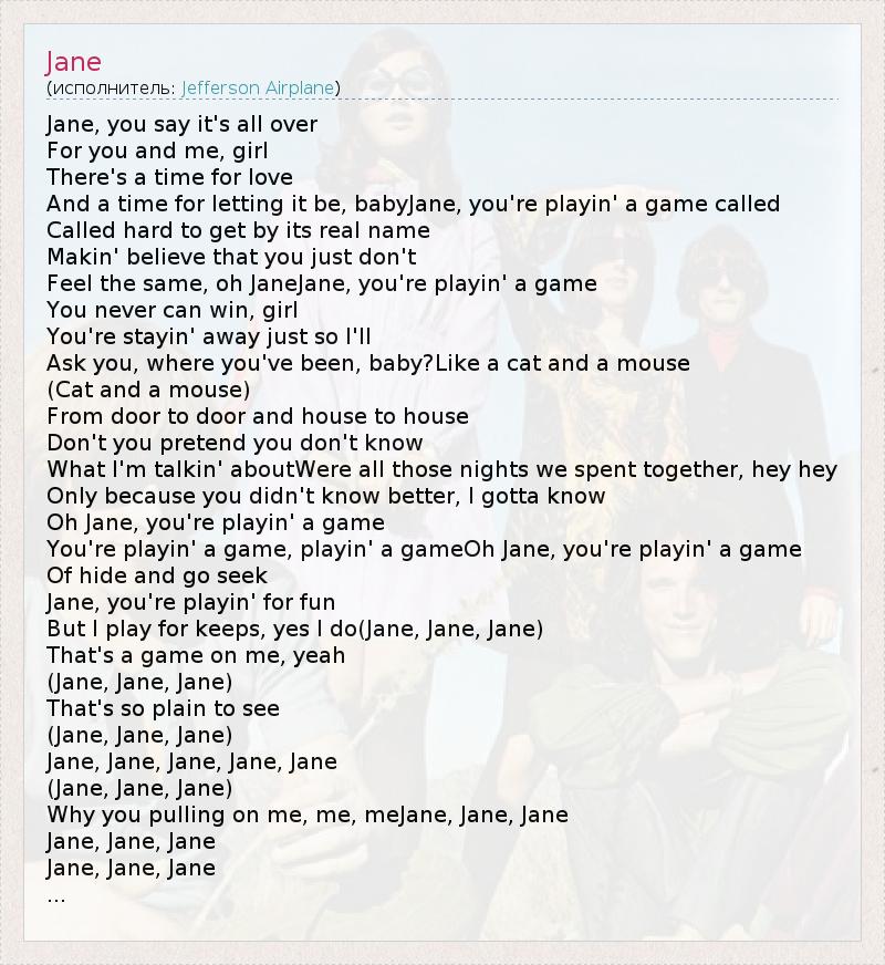 Jane, you say it's all over For you and me, girl There's a time for love And a time for letting it be, babyJane, you're playin' a game called Called hard to get by its real name Makin' believe that you just don't Feel the same, oh JaneJane, you're playin' a game You never can win, girl You're stayin' away just so I'll Ask you, where you've been, baby?Like a cat and a mouse (Cat and a mouse) From door to door and house to house Don't you pretend you don't know What I'm talkin' aboutWere all those nights we spent together, hey hey Only because you didn't know better, I gotta know Oh Jane, you're playin' a game You're playin' a game, playin' a gameOh Jane, you're playin' a game Of hide and go seek Jane, you're playin' for fun But I play for keeps, yes I do(Jane, Jane, Jane) That's a game on me, yeah (Jane, Jane, Jane) That's so plain to see (Jane, Jane, Jane) Jane, Jane, Jane, Jane, Jane (Jane, Jane, Jane) Why you pulling on me, me, meJane, Jane, Jane Jane, Jane, Jane Jane, Jane, Jane ...