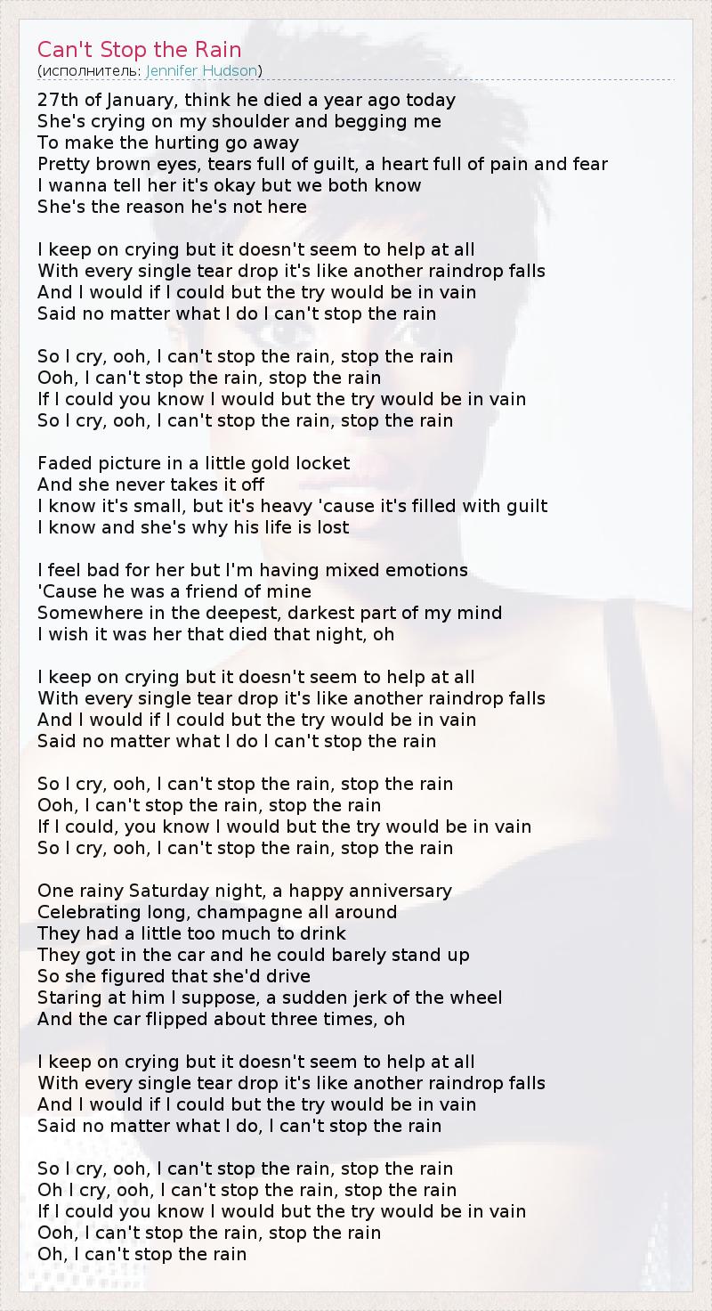 Oh I cry, ooh, I can't stop the rain, stop the rain