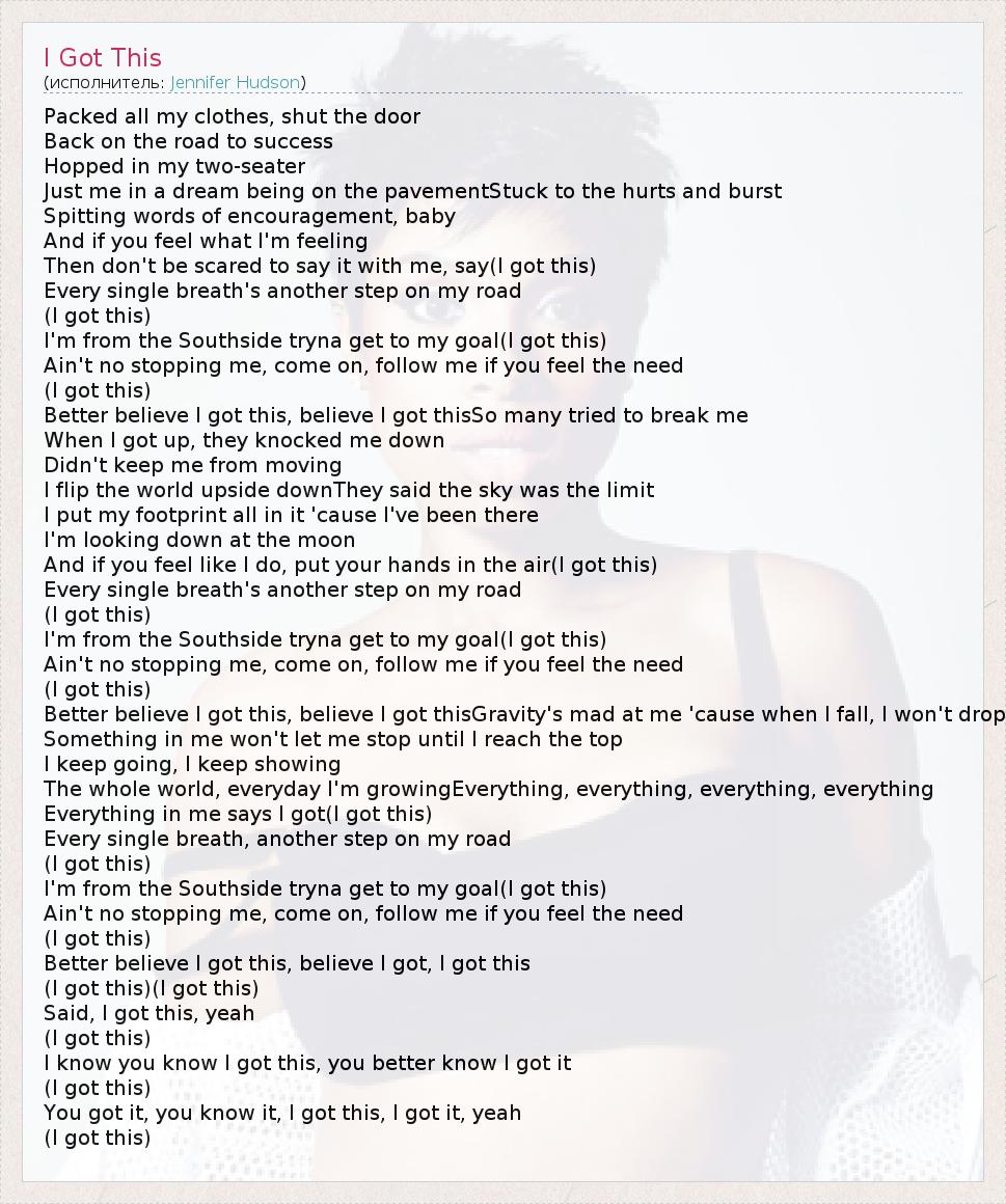 Packed all my clothes, shut the door Back on the road to success Hopped in my two-seater Just me in a dream being on the pavementStuck to the hurts and burst Spitting words of encouragement, baby And if you feel what I'm feeling Then don't be scared to say it with me, say(I got this) Every single breath's another step on my road (I got this) I'm from the Southside tryna get to my goal(I got this) Ain't no stopping me, come on, follow me if you feel the need (I got this) Better believe I got this, believe I got thisSo many tried to break me When I got up, they knocked me down Didn't keep me from moving I flip the world upside downThey said the sky was the limit I put my footprint all in it 'cause I've been there I'm looking down at the moon And if you feel like I do, put your hands in the air(I got this) Every single breath's another step on my road (I got this) I'm from the Southside tryna get to my goal(I got this) Ain't no stopping me, come on, follow me if you feel the need (I got this) Better believe I got this, believe I got thisGravity's mad at me 'cause when I fall, I won't drop Something in me won't let me stop until I reach the top I keep going, I keep showing The whole world, everyday I'm growingEverything, everything, everything, everything Everything in me says I got(I got this) Every single breath, another step on my road (I got this) I'm from the Southside tryna get to my goal(I got this) Ain't no stopping me, come on, follow me if you feel the need (I got this) Better believe I got this, believe I got, I got this (I got this)(I got this) Said, I got this, yeah (I got this) I know you know I got this, you better know I got it (I got this) You got it, you know it, I got this, I got it, yeah (I got this)
