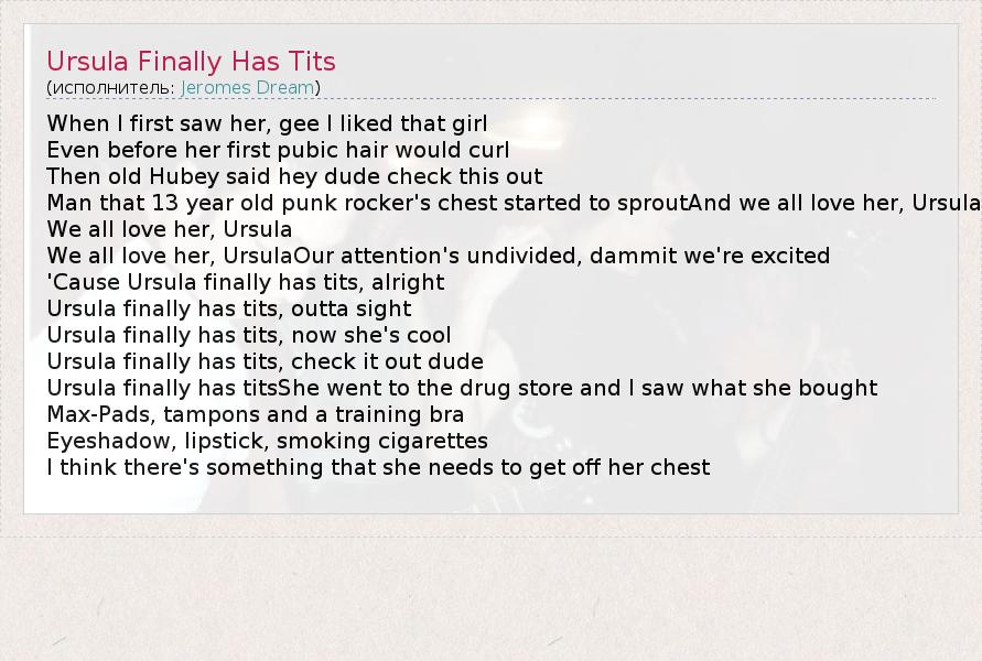 А как ты думаешь, о чем песня "Ursula Finally Has Tits" ?