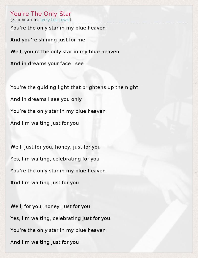 You're the only star in my blue heaven And you're shining just for me Well, you're the only star in my blue heaven And in dreams your face I see You're the guiding light that brightens up the night And in dreams I see you only You're the only star in my blue heaven And I'm waiting just for you Well, just for you, honey, just for you Yes, I'm waiting, celebrating for you You're the only star in my blue heaven And I'm waiting just for you Well, for you, honey, just for you Yes, I'm waiting, celebrating just for you You're the only star in my blue heaven And I'm waiting just for you