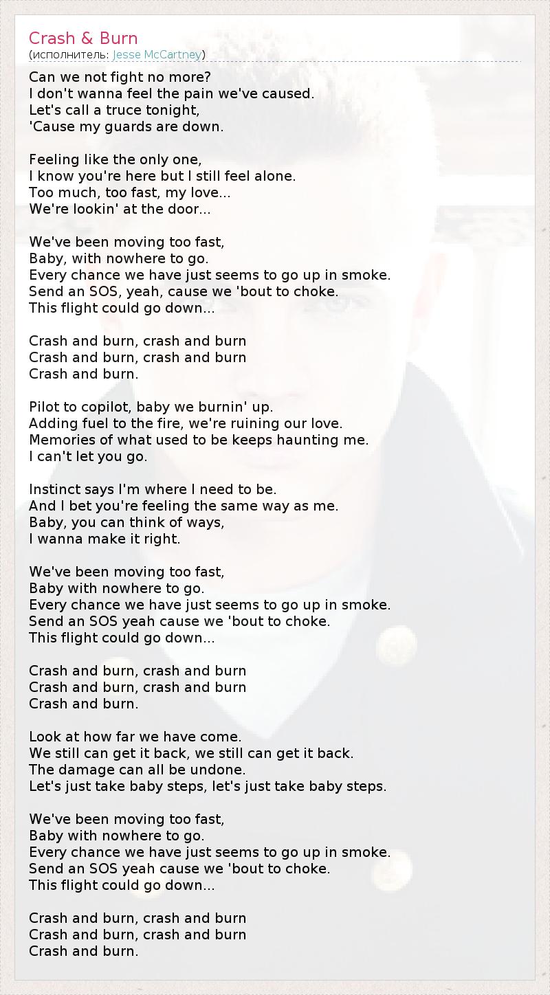 Мы можем больше не спорить? Я не хочу больше чувствовать боль, что мы причиняем друг другу. Давай объявим на сегодня перемирие, Потому что моя защита сломлена. Кажется, будто я совершенно один, Я знаю, что ты рядом, но мне все равно одиноко. Слишком много, слишком быстро, моя любовь... Вот мы уже наблюдаем конец... Мы неслись слишком быстро По дороге, которой не было вовсе. Каждый наш шанс просто испаряется. Посылаю SOS, потому что мы вот-вот задохнёмся. Этот полет может оборваться... Упадем и сгорим, упадем и сгорим Упадем и сгорим, упадем и сгорим Упадем и сгорим. Пилот - второму пилоту: "Малышка, мы горим". Подливая масла в огонь мы рушим нашу любовь. Воспоминания о том, что было прежде, преследуют меня. Я не могу тебя отпустить. Инстинкты подсказывают, что я там, где и должен быть. И я могу поспорить, что ты чувствуешь то же самое. Малышка, ты можешь придумать для нас выход, А я сделаю все как надо. Мы неслись слишком быстро По дороге, которой не было вовсе. Каждый наш шанс просто испаряется. Посылаю SOS, потому что мы вот-вот задохнёмся. Этот полет может оборваться... Упадем и сгорим, упадем и сгорим Упадем и сгорим, упадем и сгорим Упадем и сгорим. Посмотри, как далеко мы с тобой зашли. Мы еще можем повернуть обратно, еще можем повернуть. Авария может и не случиться. Давай будем двигаться маленькими шажками, маленькими шажками. Мы неслись слишком быстро По дороге, которой не было вовсе. Каждый наш шанс просто испаряется. Посылаю SOS, потому что мы вот-вот задохнёмся. Этот полет может оборваться... Упадем и сгорим, упадем и сгорим Упадем и сгорим, упадем и сгорим Упадем и сгорим.