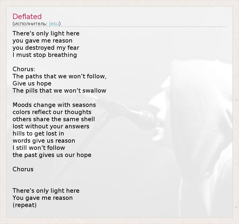 There's only light here you gave me reason you destroyed my fear I must stop breathing Chorus: The paths that we won't follow, Give us hope The pills that we won't swallow Moods change with seasons colors reflect our thoughts others share the same shell lost without your answers hills to get lost in words give us reason I still won't follow the past gives us our hope Chorus There's only light here You gave me reason (repeat)