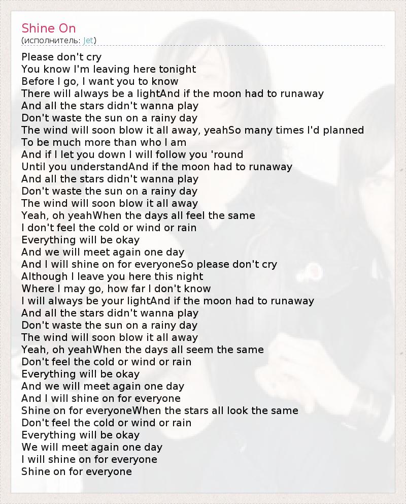 Please don't cry You know I'm leaving here tonight Before I go, I want you to know There will always be a lightAnd if the moon had to runaway And all the stars didn't wanna play Don't waste the sun on a rainy day The wind will soon blow it all away, yeahSo many times I'd planned To be much more than who I am And if I let you down I will follow you 'round Until you understandAnd if the moon had to runaway And all the stars didn't wanna play Don't waste the sun on a rainy day The wind will soon blow it all away Yeah, oh yeahWhen the days all feel the same I don't feel the cold or wind or rain Everything will be okay And we will meet again one day And I will shine on for everyoneSo please don't cry Although I leave you here this night Where I may go, how far I don't know I will always be your lightAnd if the moon had to runaway And all the stars didn't wanna play Don't waste the sun on a rainy day The wind will soon blow it all away Yeah, oh yeahWhen the days all seem the same Don't feel the cold or wind or rain Everything will be okay And we will meet again one day And I will shine on for everyone Shine on for everyoneWhen the stars all look the same Don't feel the cold or wind or rain Everything will be okay We will meet again one day I will shine on for everyone Shine on for everyone