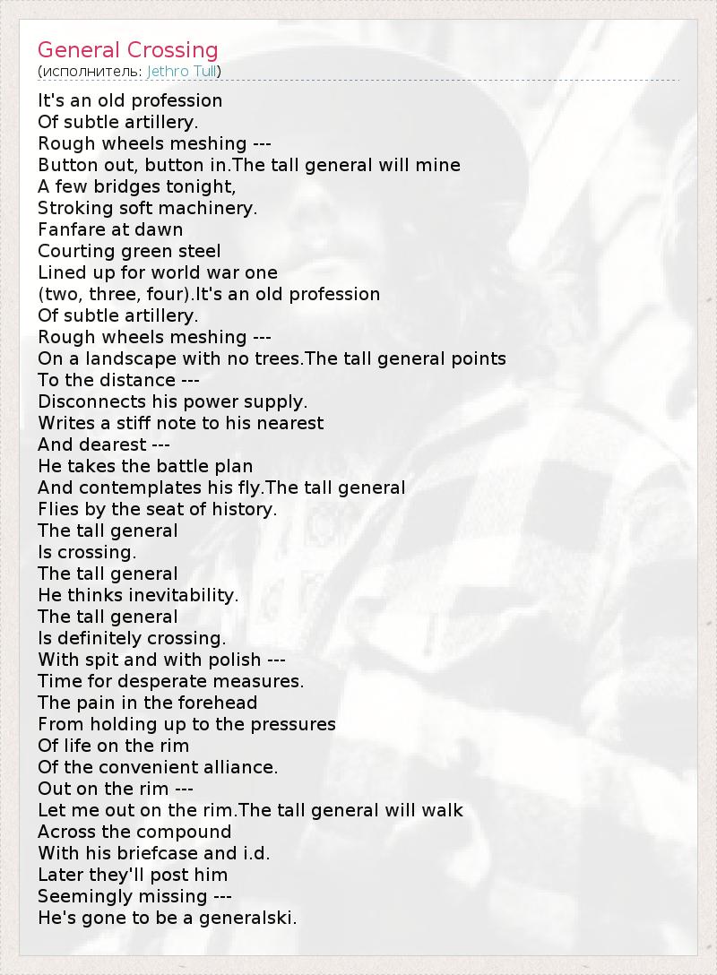 It's an old profession Of subtle artillery. Rough wheels meshing --- Button out, button in.The tall general will mine A few bridges tonight, Stroking soft machinery. Fanfare at dawn Courting green steel Lined up for world war one (two, three, four).It's an old profession Of subtle artillery. Rough wheels meshing --- On a landscape with no trees.The tall general points To the distance --- Disconnects his power supply. Writes a stiff note to his nearest And dearest --- He takes the battle plan And contemplates his fly.The tall general Flies by the seat of history. The tall general Is crossing. The tall general He thinks inevitability. The tall general Is definitely crossing. With spit and with polish --- Time for desperate measures. The pain in the forehead From holding up to the pressures Of life on the rim Of the convenient alliance. Out on the rim --- Let me out on the rim.The tall general will walk Across the compound With his briefcase and i.d. Later they'll post him Seemingly missing --- He's gone to be a generalski.