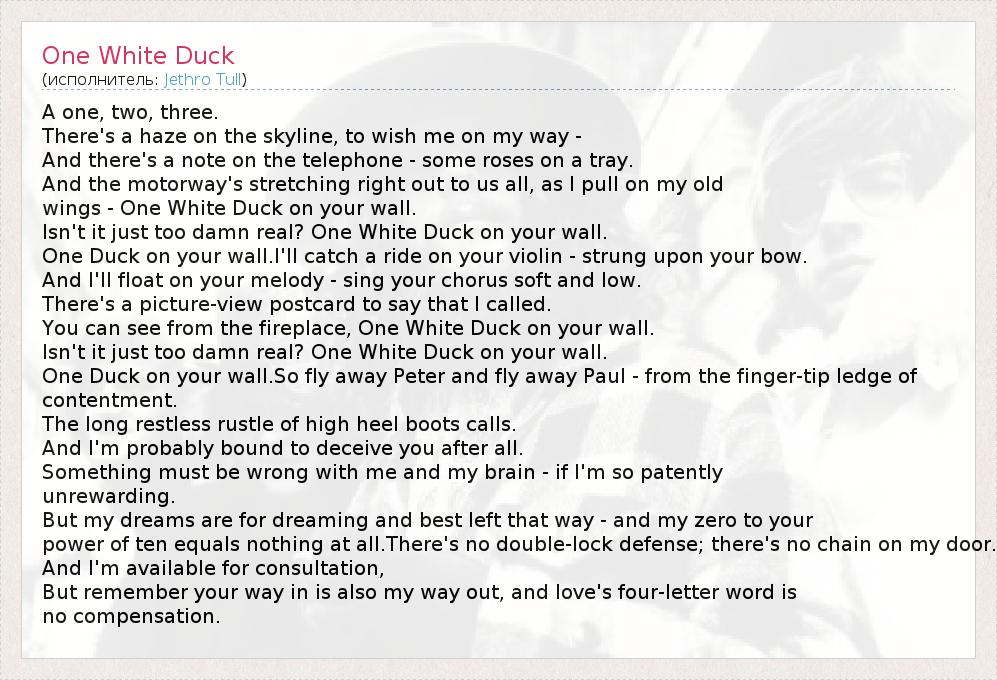 One Duck on your wall.I'll catch a ride on your violin - strung upon your bow.