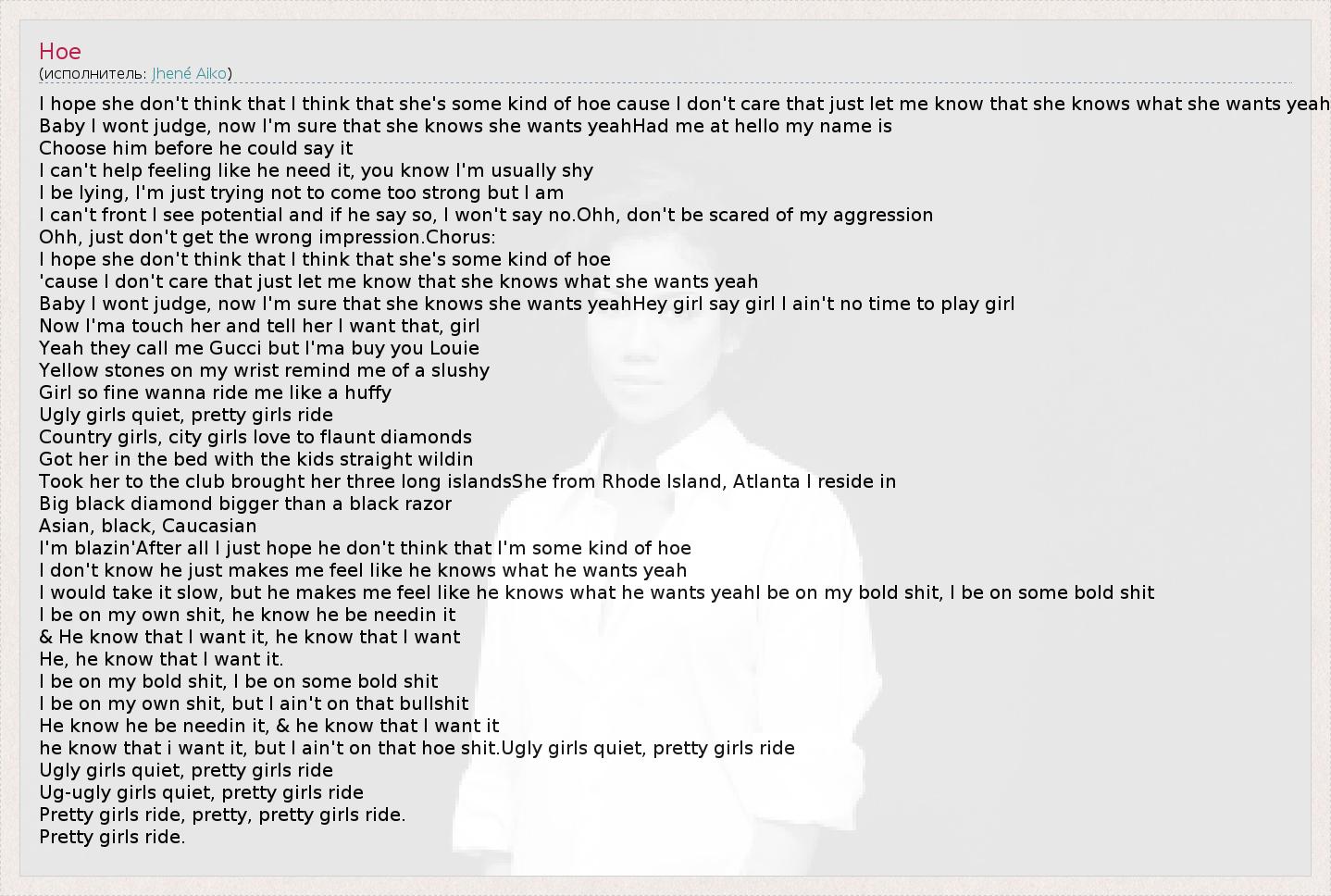 I hope she don't think that I think that she's some kind of hoe cause I don't care that just let me know that she knows what she wants yeah