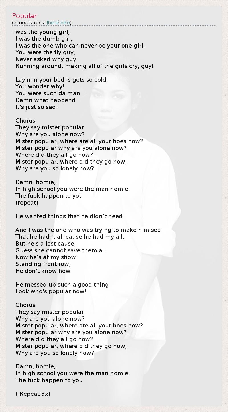 Это интересно:Джене́й А́йко Эфуру Чиломбо (род. 16 марта 1988, Лос-Анджелес), более известная как Джене́й А́йко или просто Джене́й — американская певица, автор-исполнитель. Айко — бывшая артистка лейблов The Ultimate Group и Epic Records, тем не менее оба из них она покинула сама, чтобы продолжить своё образование. Она начинала свою карьеру как «двоюродная сестра Лил Физза», на самом деле не состоят с ним в родстве. Это... продолжение
