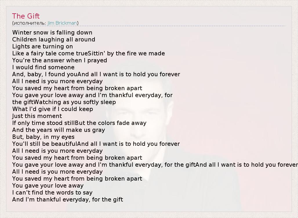 Winter snow is falling down Children laughing all around Lights are turning on Like a fairy tale come trueSittin' by the fire we made You're the answer when I prayed I would find someone And, baby, I found youAnd all I want is to hold you forever All I need is you more everyday You saved my heart from being broken apart You gave your love away and I'm thankful everyday, for the giftWatching as you softly sleep What I'd give if I could keep Just this moment If only time stood stillBut the colors fade away And the years will make us gray But, baby, in my eyes You'll still be beautifulAnd all I want is to hold you forever All I need is you more everyday You saved my heart from being broken apart You gave your love away and I'm thankful everyday, for the giftAnd all I want is to hold you forever All I need is you more everyday You saved my heart from being broken apart You gave your love away I can't find the words to say And I'm thankful everyday, for the gift