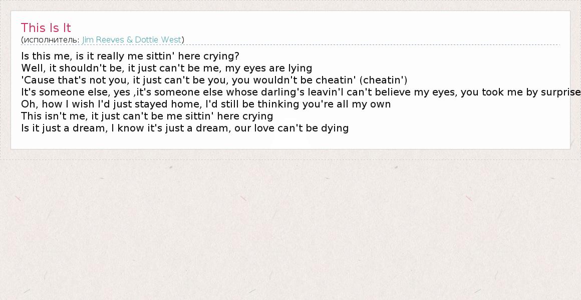 Is this me, is it really me sittin' here crying? Well, it shouldn't be, it just can't be me, my eyes are lying 'Cause that's not you, it just can't be you, you wouldn't be cheatin' (cheatin') It's someone else, yes ,it's someone else whose darling's leavin'I can't believe my eyes, you took me by surprise Oh, how I wish I'd just stayed home, I'd still be thinking you're all my own This isn't me, it just can't be me sittin' here crying Is it just a dream, I know it's just a dream, our love can't be dying