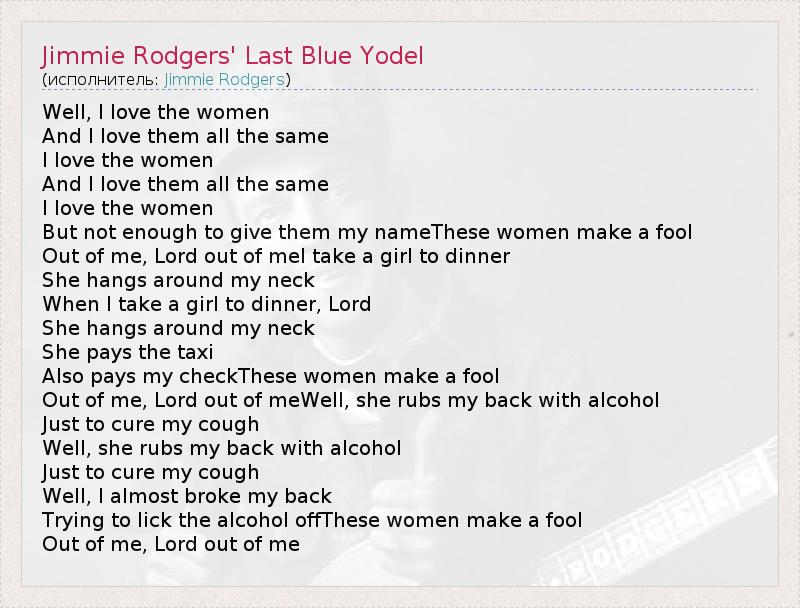 Это интересно:Пример кантри/западного йодля. Йодль (Jodeln) в культуре различных народов — особая манера пения без слов, с характерным быстрым переключением голосовых регистров, то есть с чередованием грудных и фальцетных звуков.Джимми Роджерс (Jimmie Rogers) был одним из наиболее выдающихся йодлеров, который записал несколько песен под общим названием «Blue Yodel»
