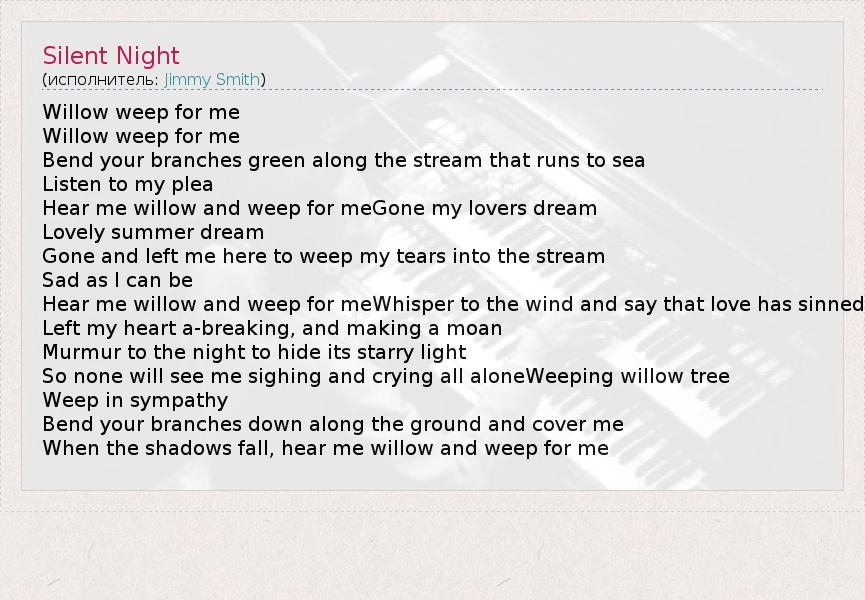 Willow weep for me Willow weep for me Bend your branches green along the stream that runs to sea Listen to my plea Hear me willow and weep for meGone my lovers dream Lovely summer dream Gone and left me here to weep my tears into the stream Sad as I can be Hear me willow and weep for meWhisper to the wind and say that love has sinned Left my heart a-breaking, and making a moan Murmur to the night to hide its starry light So none will see me sighing and crying all aloneWeeping willow tree Weep in sympathy Bend your branches down along the ground and cover me When the shadows fall, hear me willow and weep for me
