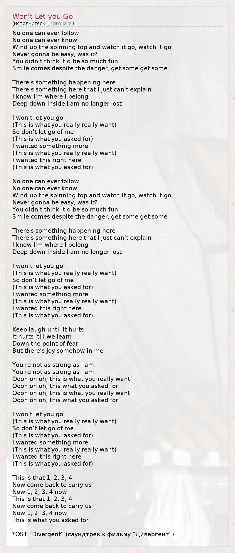No one can ever follow No one can ever know Wind up the spinning top and watch it go, watch it go Never gonna be easy, was it? You didn't think it'd be so much fun Smile comes despite the danger, get some get some There's something happening here There's something here that I just can't explain I know I'm where I belong Deep down inside I am no longer lost I won't let you go (This is what you really really want) So don't let go of me (This is what you asked for) I wanted something more (This is what you really really want) I wanted this right here (This is what you asked for) No one can ever follow No one can ever know Wind up the spinning top and watch it go, watch it go Never gonna be easy, was it? You didn't think it'd be so much fun Smile comes despite the danger, get some get some There's something happening here There's something here that I just can't explain I know I'm where I belong Deep down inside I am no longer lost I won't let you go (This is what you really really want) So don't let go of me (This is what you asked for) I wanted something more (This is what you really really want) I wanted this right here (This is what you asked for) Keep laugh until it hurts It hurts 'till we learn Down the point of fear But there's joy somehow in me You're not as strong as I am You're not as strong as I am Oooh oh oh, this is what you really want Oooh oh oh, this what you asked for Oooh oh oh, this is what you really want Oooh oh oh, this what you asked for I won't let you go (This is what you really really want) So don't let go of me (This is what you asked for) I wanted something more (This is what you really really want) I wanted this right here (This is what you asked for) This is that 1, 2, 3, 4 Now come back to carry us Now 1, 2, 3, 4 now This is that 1, 2, 3, 4 Now come back to carry us Now 1, 2, 3, 4 now This is what you asked for *OST "Divergent" (саундтрек к фильму "Дивергент")