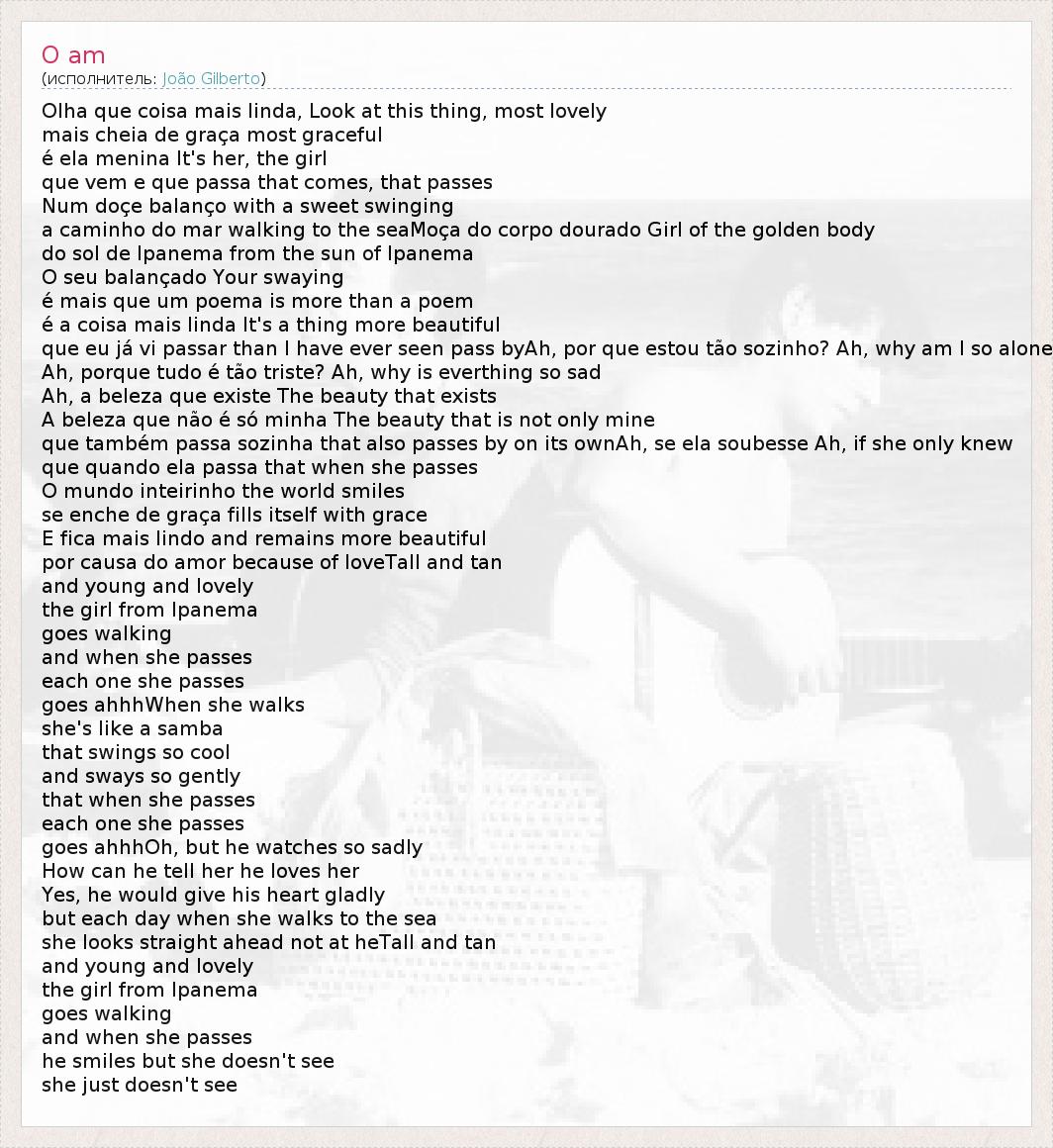 Olha que coisa mais linda, Look at this thing, most lovely mais cheia de graça most graceful é ela menina It's her, the girl que vem e que passa that comes, that passes Num doçe balanço with a sweet swinging a caminho do mar walking to the seaMoça do corpo dourado Girl of the golden body do sol de Ipanema from the sun of Ipanema O seu balançado Your swaying é mais que um poema is more than a poem é a coisa mais linda It's a thing more beautiful que eu já vi passar than I have ever seen pass byAh, por que estou tão sozinho? Ah, why am I so alone Ah, porque tudo é tão triste? Ah, why is everthing so sad Ah, a beleza que existe The beauty that exists A beleza que não é só minha The beauty that is not only mine que também passa sozinha that also passes by on its ownAh, se ela soubesse Ah, if she only knew que quando ela passa that when she passes O mundo inteirinho the world smiles se enche de graça fills itself with grace E fica mais lindo and remains more beautiful por causa do amor because of loveTall and tan and young and lovely the girl from Ipanema goes walking and when she passes each one she passes goes ahhhWhen she walks she's like a samba that swings so cool and sways so gently that when she passes each one she passes goes ahhhOh, but he watches so sadly How can he tell her he loves her Yes, he would give his heart gladly but each day when she walks to the sea she looks straight ahead not at heTall and tan and young and lovely the girl from Ipanema goes walking and when she passes he smiles but she doesn't see she just doesn't see