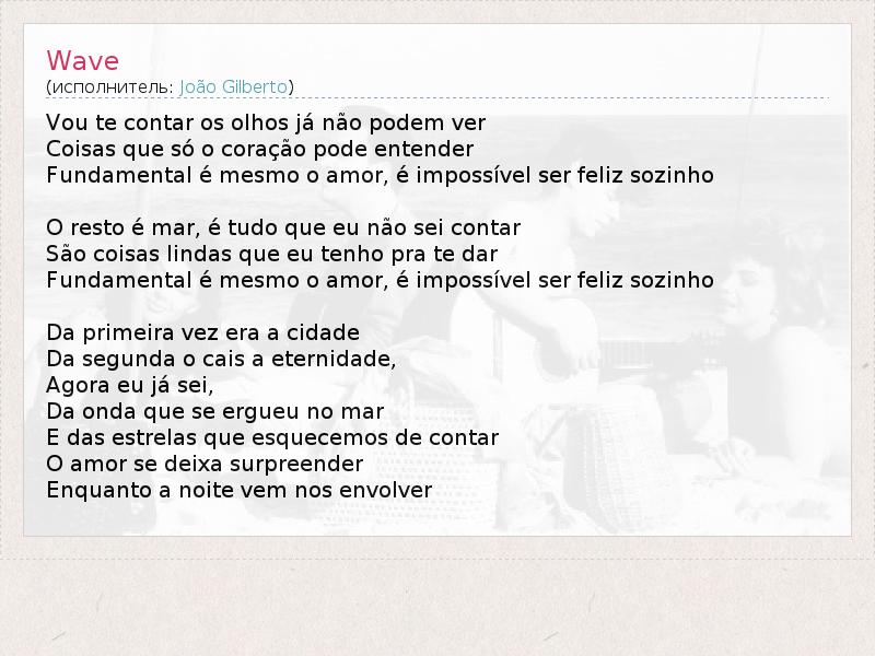Это интересно:Когда заходит разговор о босса-нове, фирменном бразильском музыкальном продукте, первый, кого вспоминают в данной связи, безусловно, Антонио Карлос (Том) Жобим, со своими песнями "The Girl From Ipanema" и "Desafinado" и другими композициями заложивший основы жанра в середине 50-х. Но, как это часто бывает, появление других музыкантов сообщило жанру несколько иное направление - как в лирическом,... продолжение