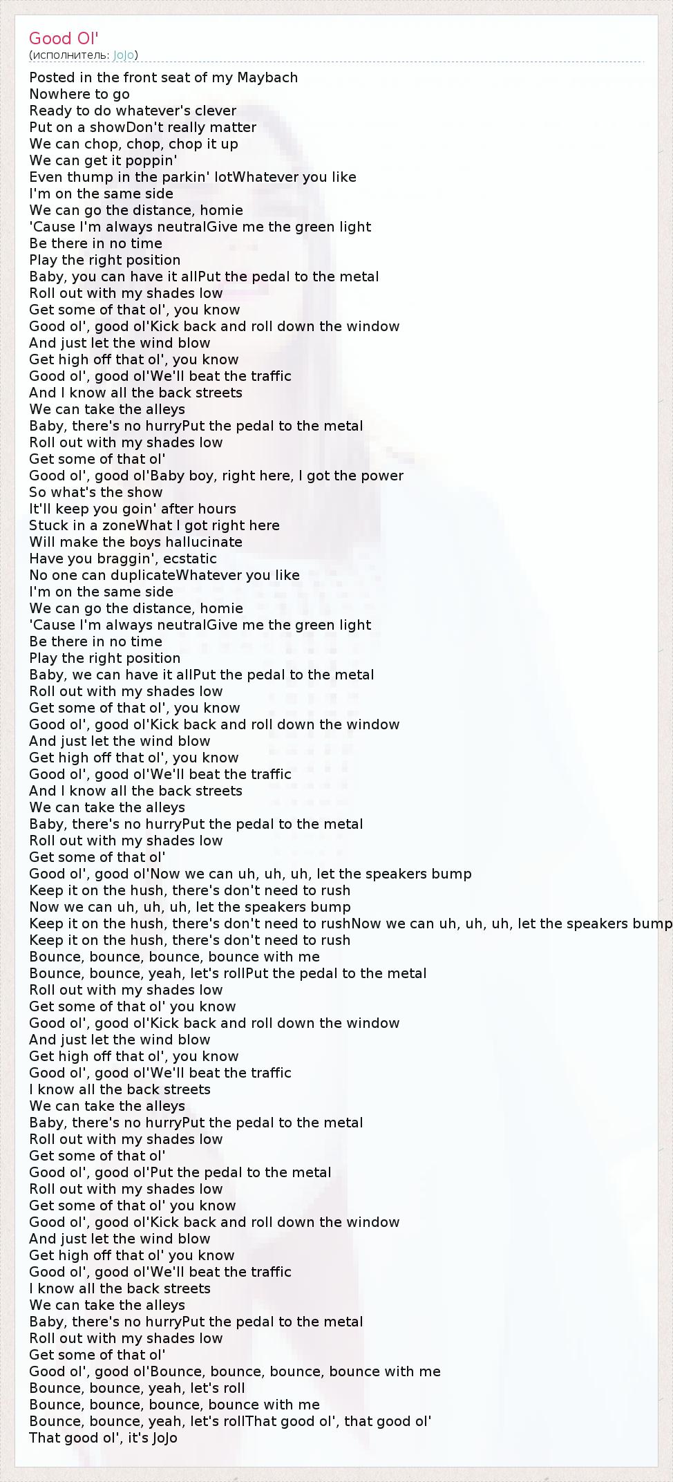 Posted in the front seat of my Maybach Nowhere to go Ready to do whatever's clever Put on a showDon't really matter We can chop, chop, chop it up We can get it poppin' Even thump in the parkin' lotWhatever you like I'm on the same side We can go the distance, homie 'Cause I'm always neutralGive me the green light Be there in no time Play the right position Baby, you can have it allPut the pedal to the metal Roll out with my shades low Get some of that ol', you know Good ol', good ol'Kick back and roll down the window And just let the wind blow Get high off that ol', you know Good ol', good ol'We'll beat the traffic And I know all the back streets We can take the alleys Baby, there's no hurryPut the pedal to the metal Roll out with my shades low Get some of that ol' Good ol', good ol'Baby boy, right here, I got the power So what's the show It'll keep you goin' after hours Stuck in a zoneWhat I got right here Will make the boys hallucinate Have you braggin', ecstatic No one can duplicateWhatever you like I'm on the same side We can go the distance, homie 'Cause I'm always neutralGive me the green light Be there in no time Play the right position Baby, we can have it allPut the pedal to the metal Roll out with my shades low Get some of that ol', you know Good ol', good ol'Kick back and roll down the window And just let the wind blow Get high off that ol', you know Good ol', good ol'We'll beat the traffic And I know all the back streets We can take the alleys Baby, there's no hurryPut the pedal to the metal Roll out with my shades low Get some of that ol' Good ol', good ol'Now we can uh, uh, uh, let the speakers bump Keep it on the hush, there's don't need to rush Now we can uh, uh, uh, let the speakers bump Keep it on the hush, there's don't need to rushNow we can uh, uh, uh, let the speakers bump Keep it on the hush, there's don't need to rush Bounce, bounce, bounce, bounce with me Bounce, bounce, yeah, let's rollPut the pedal to the metal Roll out with my shades low Get some of that ol' you know Good ol', good ol'Kick back and roll down the window And just let the wind blow Get high off that ol', you know Good ol', good ol'We'll beat the traffic I know all the back streets We can take the alleys Baby, there's no hurryPut the pedal to the metal Roll out with my shades low Get some of that ol' Good ol', good ol'Put the pedal to the metal Roll out with my shades low Get some of that ol' you know Good ol', good ol'Kick back and roll down the window And just let the wind blow Get high off that ol' you know Good ol', good ol'We'll beat the traffic I know all the back streets We can take the alleys Baby, there's no hurryPut the pedal to the metal Roll out with my shades low Get some of that ol' Good ol', good ol'Bounce, bounce, bounce, bounce with me Bounce, bounce, yeah, let's roll Bounce, bounce, bounce, bounce with me Bounce, bounce, yeah, let's rollThat good ol', that good ol' That good ol', it's JoJo