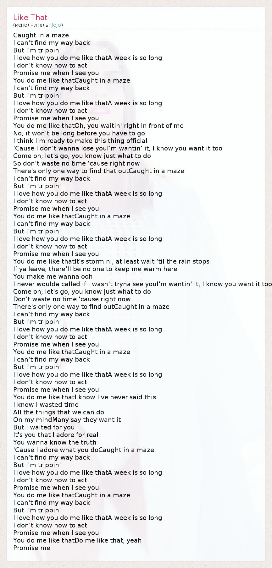 Это интересно:Джоанна Ноелл Левески или ДжоДжо выпустила дебютный альбом “JoJo” 22 июня 2004 года, который разошёлся тиражом почти 2 миллиона копий, и получил статус платинового диска. На тот момент Джоанне было всего 13 лет! Её песня "Leave (Get Out)" стала международным хитом. Второй сингл с этого альбома "Baby It's You" стал золотым.«The High Road» - второй альбом талантливой молодой американской певицы... продолжение