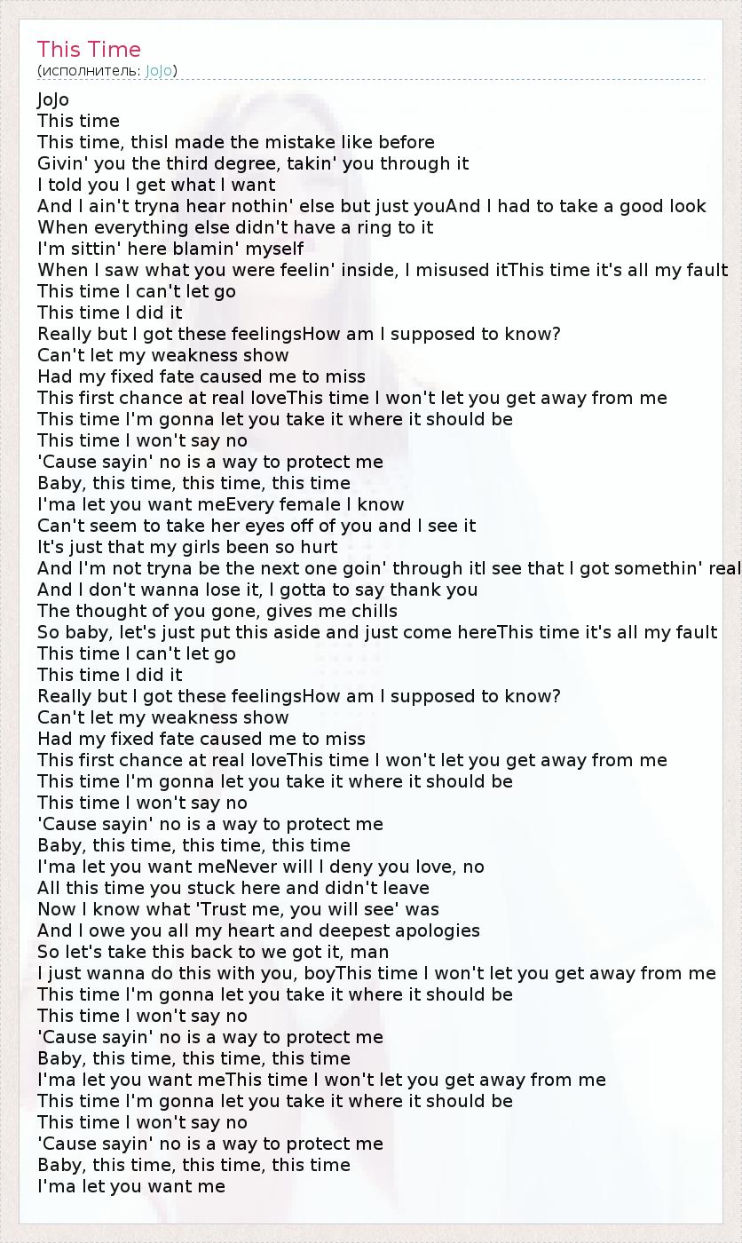 JoJo This time This time, thisI made the mistake like before Givin' you the third degree, takin' you through it I told you I get what I want And I ain't tryna hear nothin' else but just youAnd I had to take a good look When everything else didn't have a ring to it I'm sittin' here blamin' myself When I saw what you were feelin' inside, I misused itThis time it's all my fault This time I can't let go This time I did it Really but I got these feelingsHow am I supposed to know? Can't let my weakness show Had my fixed fate caused me to miss This first chance at real loveThis time I won't let you get away from me This time I'm gonna let you take it where it should be This time I won't say no 'Cause sayin' no is a way to protect me Baby, this time, this time, this time I'ma let you want meEvery female I know Can't seem to take her eyes off of you and I see it It's just that my girls been so hurt And I'm not tryna be the next one goin' through itI see that I got somethin' real And I don't wanna lose it, I gotta to say thank you The thought of you gone, gives me chills So baby, let's just put this aside and just come hereThis time it's all my fault This time I can't let go This time I did it Really but I got these feelingsHow am I supposed to know? Can't let my weakness show Had my fixed fate caused me to miss This first chance at real loveThis time I won't let you get away from me This time I'm gonna let you take it where it should be This time I won't say no 'Cause sayin' no is a way to protect me Baby, this time, this time, this time I'ma let you want meNever will I deny you love, no All this time you stuck here and didn't leave Now I know what 'Trust me, you will see' was And I owe you all my heart and deepest apologies So let's take this back to we got it, man I just wanna do this with you, boyThis time I won't let you get away from me This time I'm gonna let you take it where it should be This time I won't say no 'Cause sayin' no is a way to protect me Baby, this time, this time, this time I'ma let you want meThis time I won't let you get away from me This time I'm gonna let you take it where it should be This time I won't say no 'Cause sayin' no is a way to protect me Baby, this time, this time, this time I'ma let you want me