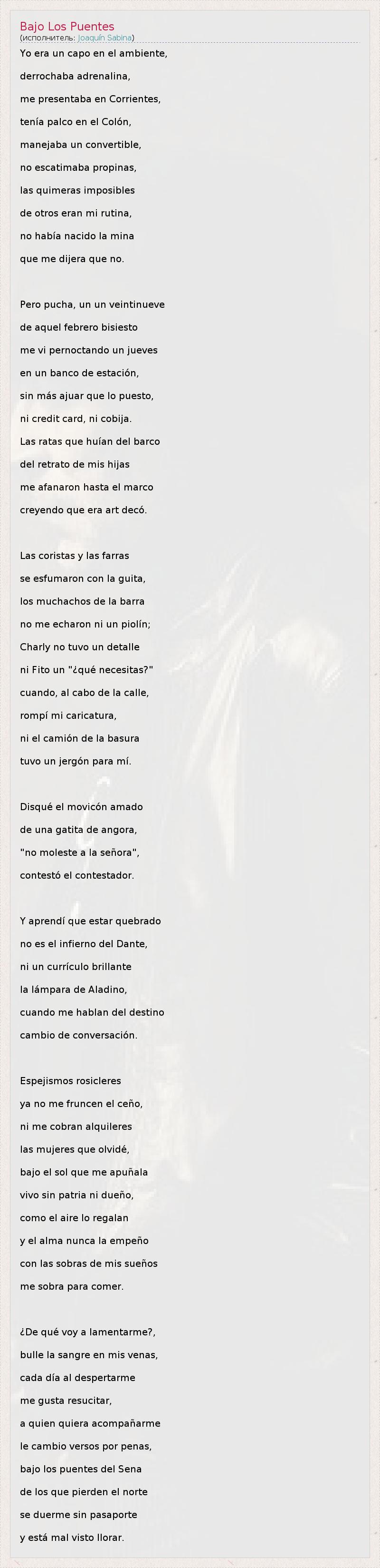 Yo era un capo en el ambiente, derrochaba adrenalina, me presentaba en Corrientes, tenía palco en el Colón, manejaba un convertible, no escatimaba propinas, las quimeras imposibles de otros eran mi rutina, no había nacido la mina que me dijera que no. Pero pucha, un un veintinueve de aquel febrero bisiesto me vi pernoctando un jueves en un banco de estación, sin más ajuar que lo puesto, ni credit card, ni cobija. Las ratas que huían del barco del retrato de mis hijas me afanaron hasta el marco creyendo que era art decó. Las coristas y las farras se esfumaron con la guita, los muchachos de la barra no me echaron ni un piolín; Charly no tuvo un detalle ni Fito un "¿qué necesitas?" cuando, al cabo de la calle, rompí mi caricatura, ni el camión de la basura tuvo un jergón para mí. Disqué el movicón amado de una gatita de angora, "no moleste a la señora", contestó el contestador. Y aprendí que estar quebrado no es el infierno del Dante, ni un currículo brillante la lámpara de Aladino, cuando me hablan del destino cambio de conversación. Espejismos rosicleres ya no me fruncen el ceño, ni me cobran alquileres las mujeres que olvidé, bajo el sol que me apuñala vivo sin patria ni dueño, como el aire lo regalan y el alma nunca la empeño con las sobras de mis sueños me sobra para comer. ¿De qué voy a lamentarme?, bulle la sangre en mis venas, cada día al despertarme me gusta resucitar, a quien quiera acompañarme le cambio versos por penas, bajo los puentes del Sena de los que pierden el norte se duerme sin pasaporte y está mal visto llorar.
