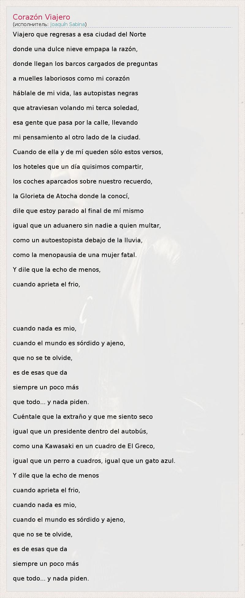 Это интересно:Хоаки́н Рамо́н Марти́нес Саби́на (исп. Joaquín Ramón Martínez Sabina, род. 12 февраля 1949, Убеда, Испания) — испанский рок-поэт, певец, композитор; один из столпов современной испаноязычной поп и рок-культуры. Автор-исполнитель, поставивший своё имя в один ряд с именами Боба Дилана, Жака Бреля, Сержа Генсбура или Бориса Гребенщикова, сходным образом оказавших влияние на культуру стран родного языка.Родился... продолжение