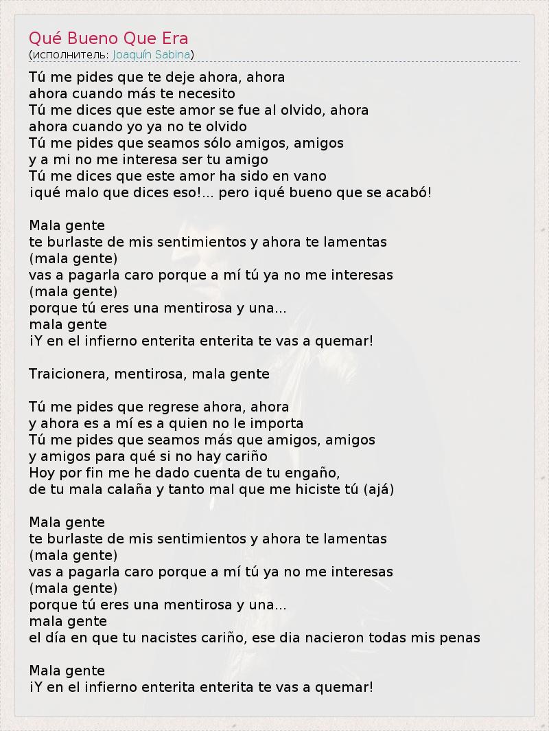 Ты меня просишь, чтобы я теперь тебя оставил, теперь, Теперь, когда так в тебе нуждаюсь! Ты мне говоришь, что эта любовь ушла в небытие, сейчас, Сейчас, когда я тебя не могу забыть. Ты меня просишь, чтобы мы были только друзьями, друзьями, Но меня не интересует твоя дружба. Ты мне говоришь, что это была бесполезная любовь – Как плохо, что ты говоришь такое!...но, как хорошо, что все закончилось! Вредитель, Ты подтрунивала над моими чувствами и теперь жалеешь меня. (плохая) Ты дорого заплатишь за это, потому что ты меня больше не интересуешь. (плохая) Потому что ты лгунья и... Вредитель. И ты будешь гореть вечном, вечном аду! Предательница, лгунья, вредитель! Ты просишь, чтобы я возвратился теперь, теперь, Но теперь я тот, кого это не интересует. Ты просишь меня, чтобы мы стали больше, чем друзья, друзья, Но для чего те друзья, между которыми нет дружбы. Теперь, наконец, я отдаю себя отчет в твоей лжи, Твоем скверном характере, и тому количеству зла, что ты мне причинила (ага). Вредитель, Ты подтрунивала над моими чувствами, и теперь жалеешь меня. (плохая) Ты дорого заплатишь за это, потому что ты меня больше не интересуешь. (плохая) Потому что ты лгунья и... Вредитель. В день, когда ты родилась, появились все мои горести. Вредитель. И ты будешь гореть вечном, вечном аду! * досл. плохой человек