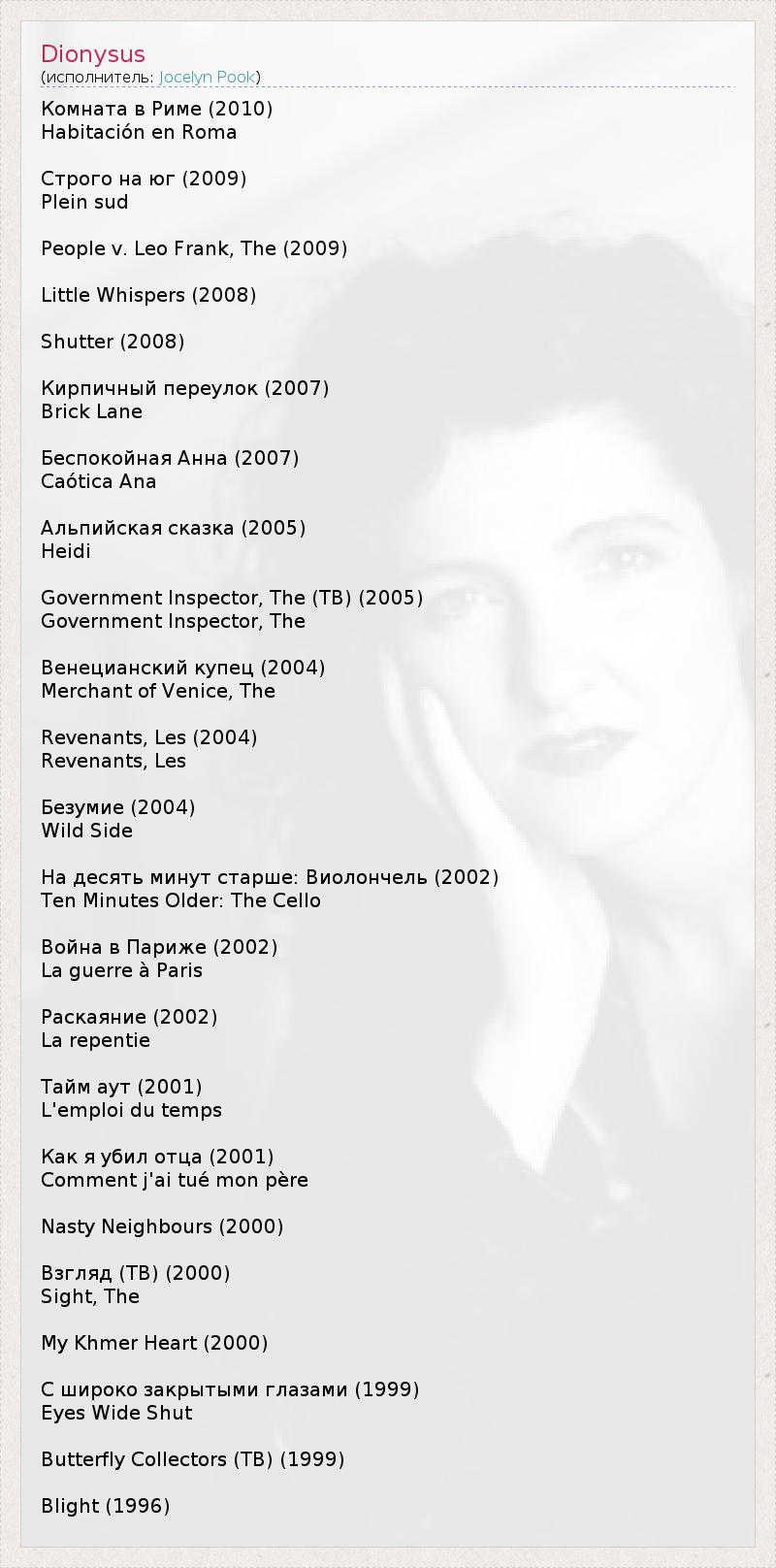 Комната в Риме (2010) Habitación en Roma Строго на юг (2009) Plein sud People v. Leo Frank, The (2009) Little Whispers (2008) Shutter (2008) Кирпичный переулок (2007) Brick Lane Беспокойная Анна (2007) Caótica Ana Альпийская сказка (2005) Heidi Government Inspector, The (ТВ) (2005) Government Inspector, The Венецианский купец (2004) Merchant of Venice, The Revenants, Les (2004) Revenants, Les Безумие (2004) Wild Side На десять минут старше: Виолончель (2002) Ten Minutes Older: The Cello Война в Париже (2002) La guerre à Paris Раскаяние (2002) La repentie Тайм аут (2001) L'emploi du temps Как я убил отца (2001) Comment j'ai tué mon père Nasty Neighbours (2000) Взгляд (ТВ) (2000) Sight, The My Khmer Heart (2000) С широко закрытыми глазами (1999) Eyes Wide Shut Butterfly Collectors (ТВ) (1999) Blight (1996)