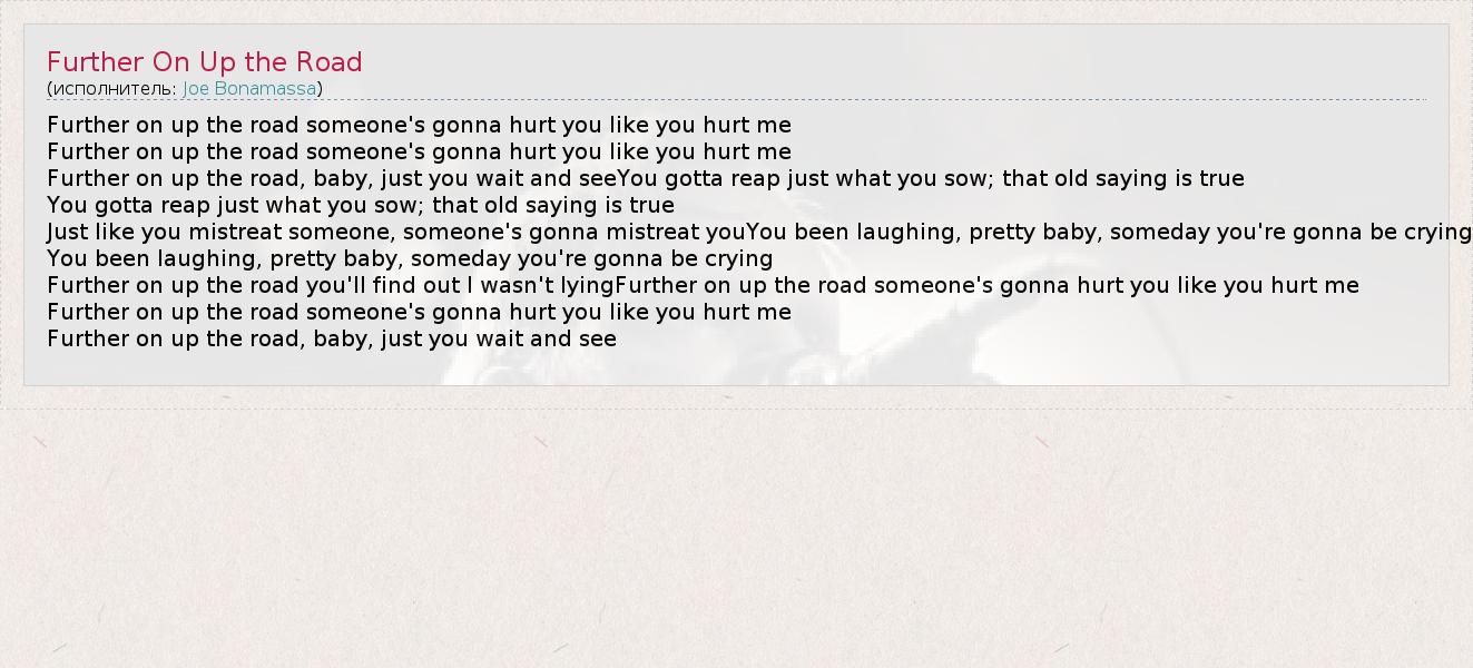 Further on up the road you'll find out I wasn't lyingFurther on up the road someone's gonna hurt you like you hurt me