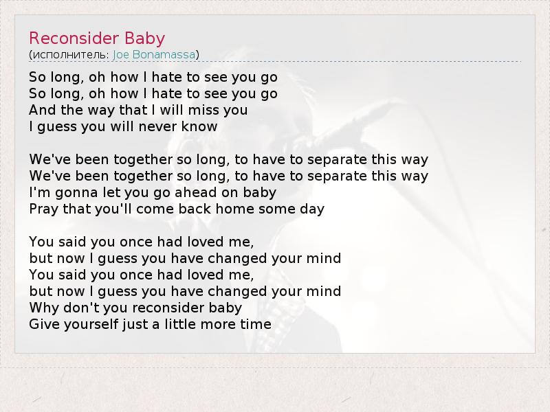 So long, oh how I hate to see you go So long, oh how I hate to see you go And the way that I will miss you I guess you will never know We've been together so long, to have to separate this way We've been together so long, to have to separate this way I'm gonna let you go ahead on baby Pray that you'll come back home some day You said you once had loved me, but now I guess you have changed your mind You said you once had loved me, but now I guess you have changed your mind Why don't you reconsider baby Give yourself just a little more time