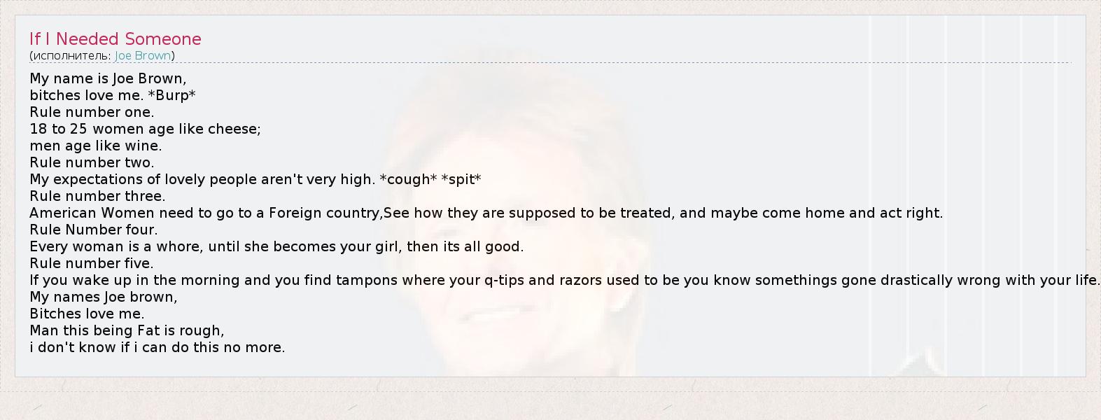 My name is Joe Brown, bitches love me. *Burp* Rule number one. 18 to 25 women age like cheese; men age like wine. Rule number two. My expectations of lovely people aren't very high. *cough* *spit* Rule number three. American Women need to go to a Foreign country,See how they are supposed to be treated, and maybe come home and act right. Rule Number four. Every woman is a whore, until she becomes your girl, then its all good. Rule number five. If you wake up in the morning and you find tampons where your q-tips and razors used to be you know somethings gone drastically wrong with your life. My names Joe brown, Bitches love me. Man this being Fat is rough, i don't know if i can do this no more.