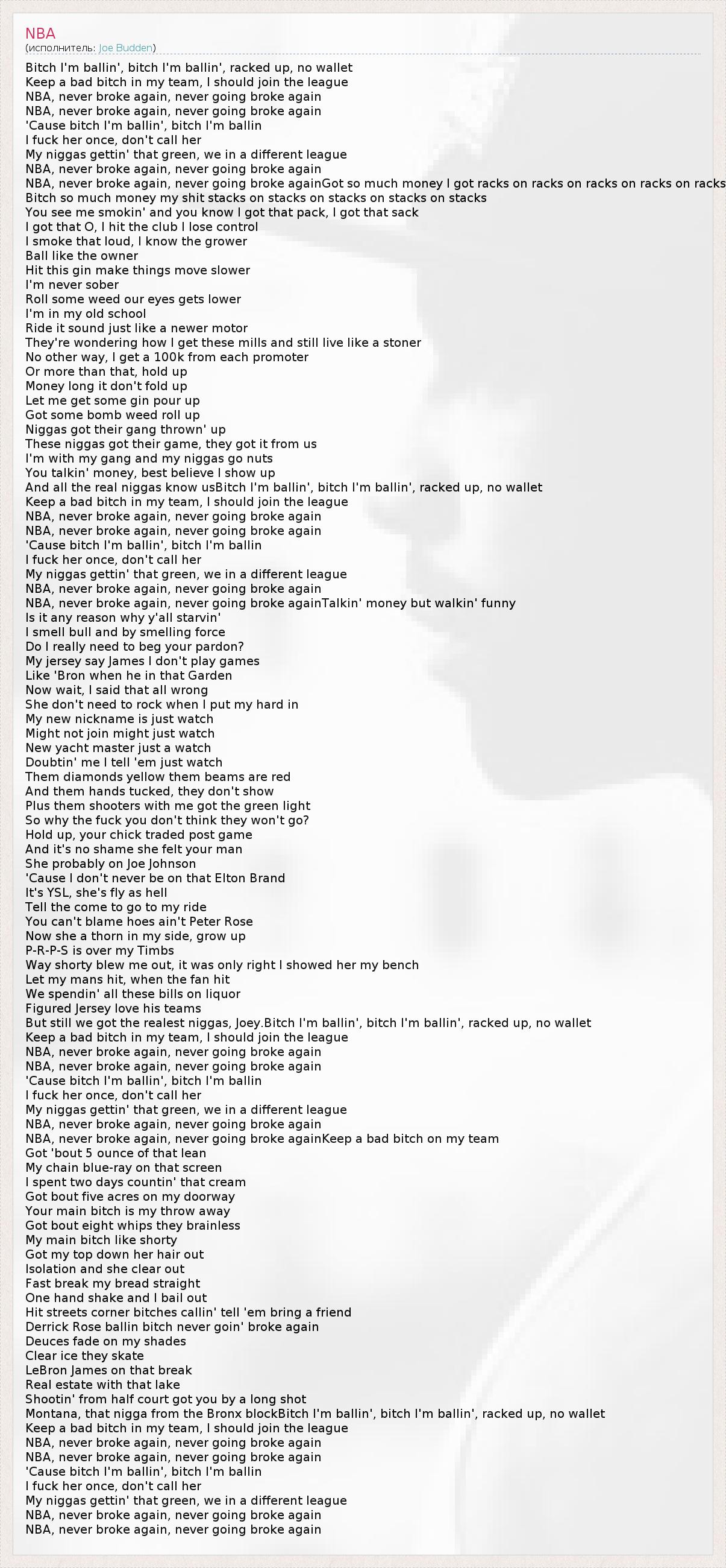 Bitch I'm ballin', bitch I'm ballin', racked up, no wallet Keep a bad bitch in my team, I should join the league NBA, never broke again, never going broke again NBA, never broke again, never going broke again 'Cause bitch I'm ballin', bitch I'm ballin I fuck her once, don't call her My niggas gettin' that green, we in a different league NBA, never broke again, never going broke again NBA, never broke again, never going broke againGot so much money I got racks on racks on racks on racks on racks Bitch so much money my shit stacks on stacks on stacks on stacks on stacks You see me smokin' and you know I got that pack, I got that sack I got that O, I hit the club I lose control I smoke that loud, I know the grower Ball like the owner Hit this gin make things move slower I'm never sober Roll some weed our eyes gets lower I'm in my old school Ride it sound just like a newer motor They're wondering how I get these mills and still live like a stoner No other way, I get a 100k from each promoter Or more than that, hold up Money long it don't fold up Let me get some gin pour up Got some bomb weed roll up Niggas got their gang thrown' up These niggas got their game, they got it from us I'm with my gang and my niggas go nuts You talkin' money, best believe I show up And all the real niggas know usBitch I'm ballin', bitch I'm ballin', racked up, no wallet Keep a bad bitch in my team, I should join the league NBA, never broke again, never going broke again NBA, never broke again, never going broke again 'Cause bitch I'm ballin', bitch I'm ballin I fuck her once, don't call her My niggas gettin' that green, we in a different league NBA, never broke again, never going broke again NBA, never broke again, never going broke againTalkin' money but walkin' funny Is it any reason why y'all starvin' I smell bull and by smelling force Do I really need to beg your pardon? My jersey say James I don't play games Like 'Bron when he in that Garden Now wait, I said that all wrong She don't need to rock when I put my hard in My new nickname is just watch Might not join might just watch New yacht master just a watch Doubtin' me I tell 'em just watch Them diamonds yellow them beams are red And them hands tucked, they don't show Plus them shooters with me got the green light So why the fuck you don't think they won't go? Hold up, your chick traded post game And it's no shame she felt your man She probably on Joe Johnson 'Cause I don't never be on that Elton Brand It's YSL, she's fly as hell Tell the come to go to my ride You can't blame hoes ain't Peter Rose Now she a thorn in my side, grow up P-R-P-S is over my Timbs Way shorty blew me out, it was only right I showed her my bench Let my mans hit, when the fan hit We spendin' all these bills on liquor Figured Jersey love his teams But still we got the realest niggas, Joey.Bitch I'm ballin', bitch I'm ballin', racked up, no wallet Keep a bad bitch in my team, I should join the league NBA, never broke again, never going broke again NBA, never broke again, never going broke again 'Cause bitch I'm ballin', bitch I'm ballin I fuck her once, don't call her My niggas gettin' that green, we in a different league NBA, never broke again, never going broke again NBA, never broke again, never going broke againKeep a bad bitch on my team Got 'bout 5 ounce of that lean My chain blue-ray on that screen I spent two days countin' that cream Got bout five acres on my doorway Your main bitch is my throw away Got bout eight whips they brainless My main bitch like shorty Got my top down her hair out Isolation and she clear out Fast break my bread straight One hand shake and I bail out Hit streets corner bitches callin' tell 'em bring a friend Derrick Rose ballin bitch never goin' broke again Deuces fade on my shades Clear ice they skate LeBron James on that break Real estate with that lake Shootin' from half court got you by a long shot Montana, that nigga from the Bronx blockBitch I'm ballin', bitch I'm ballin', racked up, no wallet Keep a bad bitch in my team, I should join the league NBA, never broke again, never going broke again NBA, never broke again, never going broke again 'Cause bitch I'm ballin', bitch I'm ballin I fuck her once, don't call her My niggas gettin' that green, we in a different league NBA, never broke again, never going broke again NBA, never broke again, never going broke again