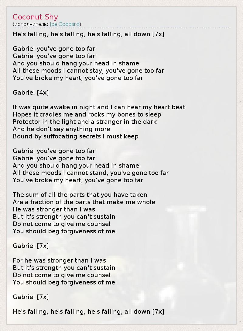 Он падает, он падает, он падает вниз [7x] Габриэль, ты зашел слишком далеко, Габриэль, ты зашел слишком далеко, Ты должен в стыде склонить свою голову, Терпеть не могу эти капризы, ты зашел слишком далеко, Ты разбил мое сердце, ты слишком далеко зашел. Габриэль [4x] В ночной тишине я не могу уснуть и слушаю стук своего сердца, Надеясь, что он убаюкает меня и заставит погрузиться в сон. Покровитель при свете дня и незнакомец во тьме, И он не говорит больше ни слова, Связанный удущающими секретами, которые я должна хранить. Габриэль, ты зашел слишком далеко, Ты должен в стыде склонить свою голову, Терпеть не могу эти капризы, ты зашел слишком далеко, Ты разбил мое сердце, ты слишком далеко зашел. Все те частички, что ты забрал - Это лишь фрагмент того, что делает меня целым. Он был сильнее меня, Но такую силу нельзя выдержать, Не приходи, чтобы давать мне советы, Ты должен умолять меня о прощении. Габриэль [7x] Ведь он был сильнее меня, Но такую силу нельзя выдержать, Не приходи, чтобы давать мне советы, Ты должен умолять меня о прощении. Габриэль [7x] Он падает, он падает, он падает вниз [7x]