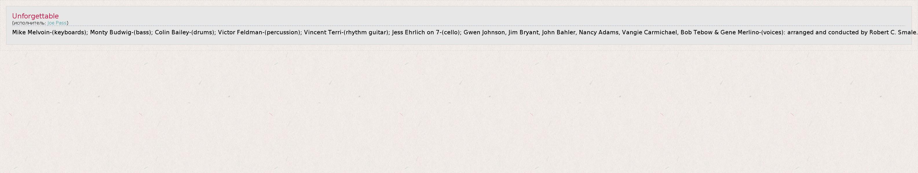 Это интересно:Джо Пасс (Joseph Anthony Passalaqua, родился 13 января 1929 года в Нью-Брансуике, штат Нью-Джерси, США, умер 23 мая 1994 года в Лос-Анджелесе, штат Калифорния), джаз гитарист. Его широкое использование «шагающего» баса, искусство одновременного сочетания нескольких мелодических линий в процессе импровизации и сочетание множества техник игры открыли новые возможности для мира джаз-гитары и оказали огромное... продолжение