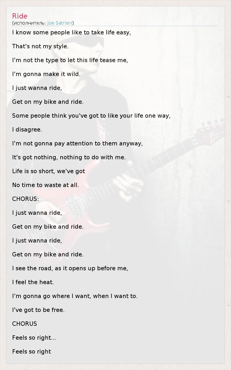 I know some people like to take life easy, That's not my style. I'm not the type to let this life tease me, I'm gonna make it wild. I just wanna ride, Get on my bike and ride. Some people think you've got to like your life one way, I disagree. I'm not gonna pay attention to them anyway, It's got nothing, nothing to do with me. Life is so short, we've got No time to waste at all. CHORUS: I just wanna ride, Get on my bike and ride. I just wanna ride, Get on my bike and ride. I see the road, as it opens up before me, I feel the heat. I'm gonna go where I want, when I want to. I've got to be free. CHORUS Feels so right... Feels so right