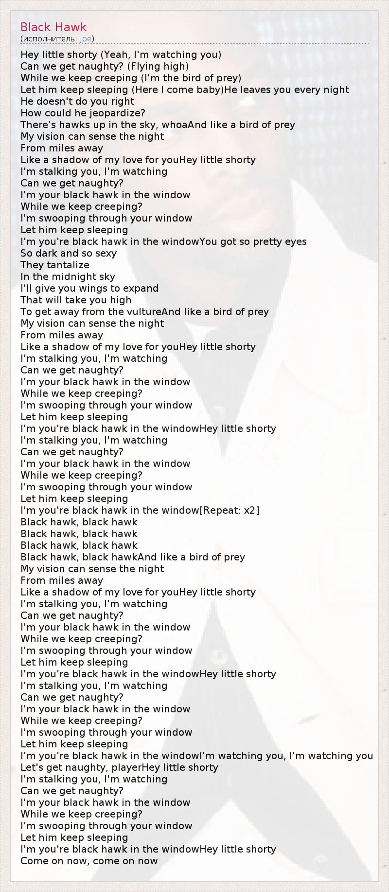 I'm you're black hawk in the windowHey little shorty