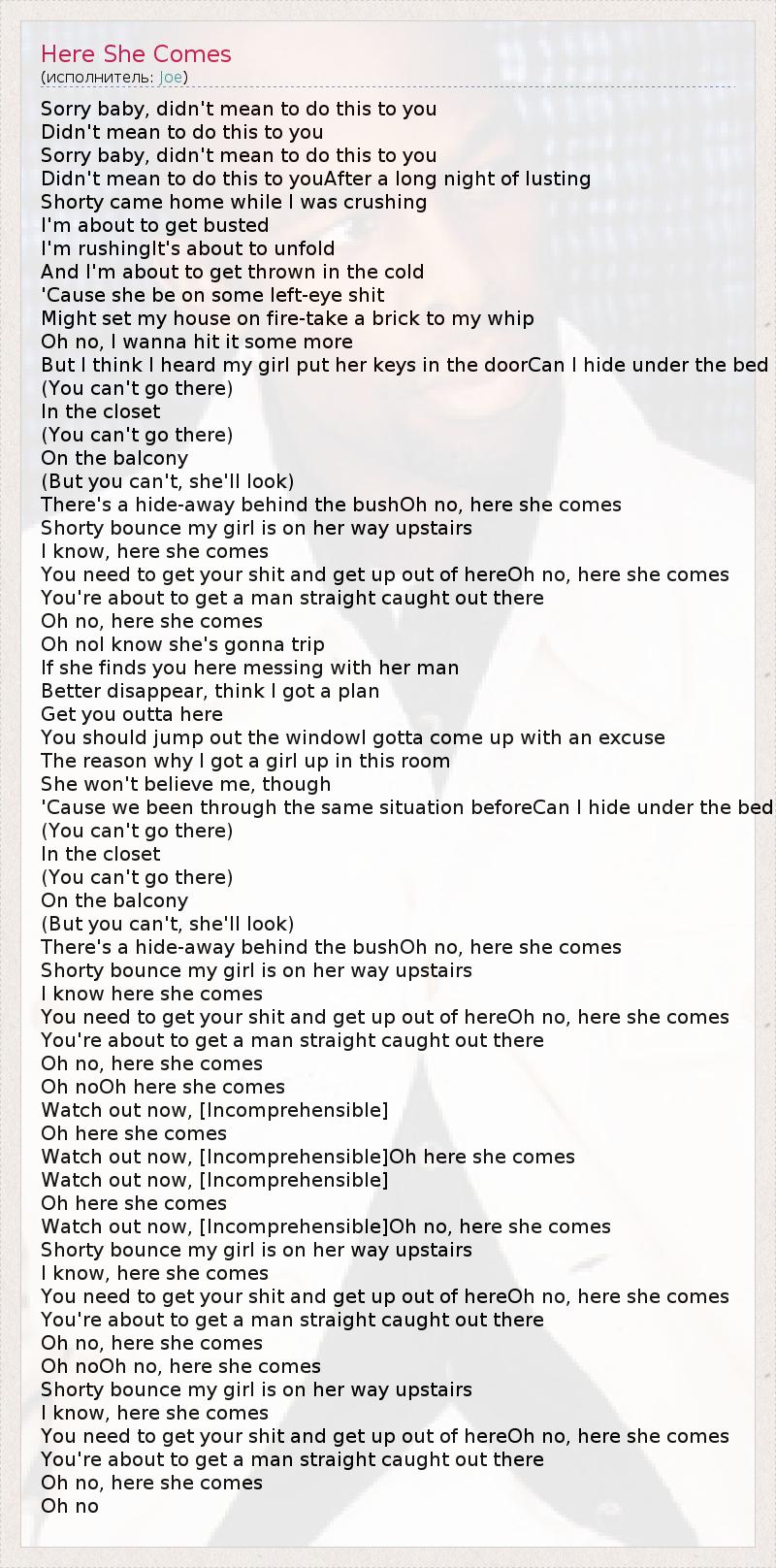 Sorry baby, didn't mean to do this to you Didn't mean to do this to you Sorry baby, didn't mean to do this to you Didn't mean to do this to youAfter a long night of lusting Shorty came home while I was crushing I'm about to get busted I'm rushingIt's about to unfold And I'm about to get thrown in the cold 'Cause she be on some left-eye shit Might set my house on fire-take a brick to my whip Oh no, I wanna hit it some more But I think I heard my girl put her keys in the doorCan I hide under the bed (You can't go there) In the closet (You can't go there) On the balcony (But you can't, she'll look) There's a hide-away behind the bushOh no, here she comes Shorty bounce my girl is on her way upstairs I know, here she comes You need to get your shit and get up out of hereOh no, here she comes You're about to get a man straight caught out there Oh no, here she comes Oh noI know she's gonna trip If she finds you here messing with her man Better disappear, think I got a plan Get you outta here You should jump out the windowI gotta come up with an excuse The reason why I got a girl up in this room She won't believe me, though 'Cause we been through the same situation beforeCan I hide under the bed (You can't go there) In the closet (You can't go there) On the balcony (But you can't, she'll look) There's a hide-away behind the bushOh no, here she comes Shorty bounce my girl is on her way upstairs I know here she comes You need to get your shit and get up out of hereOh no, here she comes You're about to get a man straight caught out there Oh no, here she comes Oh noOh here she comes Watch out now, [Incomprehensible] Oh here she comes Watch out now, [Incomprehensible]Oh here she comes Watch out now, [Incomprehensible] Oh here she comes Watch out now, [Incomprehensible]Oh no, here she comes Shorty bounce my girl is on her way upstairs I know, here she comes You need to get your shit and get up out of hereOh no, here she comes You're about to get a man straight caught out there Oh no, here she comes Oh noOh no, here she comes Shorty bounce my girl is on her way upstairs I know, here she comes You need to get your shit and get up out of hereOh no, here she comes You're about to get a man straight caught out there Oh no, here she comes Oh no