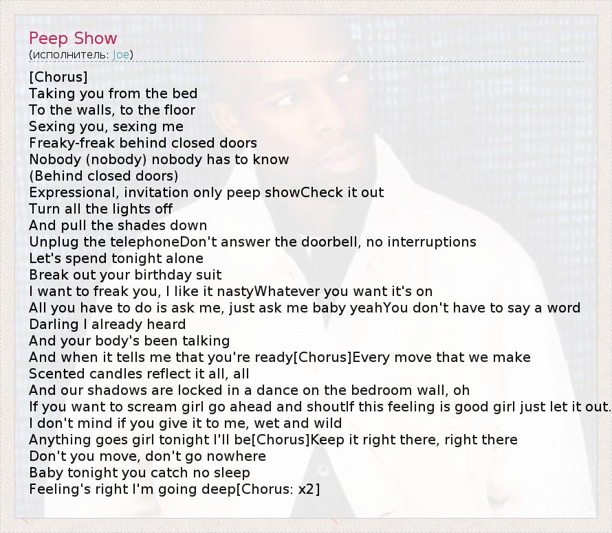 [Chorus] Taking you from the bed To the walls, to the floor Sexing you, sexing me Freaky-freak behind closed doors Nobody (nobody) nobody has to know (Behind closed doors) Expressional, invitation only peep showCheck it out Turn all the lights off And pull the shades down Unplug the telephoneDon't answer the doorbell, no interruptions Let's spend tonight alone Break out your birthday suit I want to freak you, I like it nastyWhatever you want it's on All you have to do is ask me, just ask me baby yeahYou don't have to say a word Darling I already heard And your body's been talking And when it tells me that you're ready[Chorus]Every move that we make Scented candles reflect it all, all And our shadows are locked in a dance on the bedroom wall, oh If you want to scream girl go ahead and shoutIf this feeling is good girl just let it out. I don't mind if you give it to me, wet and wild Anything goes girl tonight I'll be[Chorus]Keep it right there, right there Don't you move, don't go nowhere Baby tonight you catch no sleep Feeling's right I'm going deep[Chorus: x2]