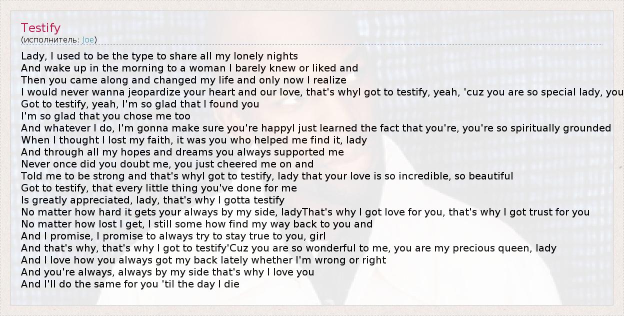I would never wanna jeopardize your heart and our love, that's whyI got to testify, yeah, 'cuz you are so special lady, you