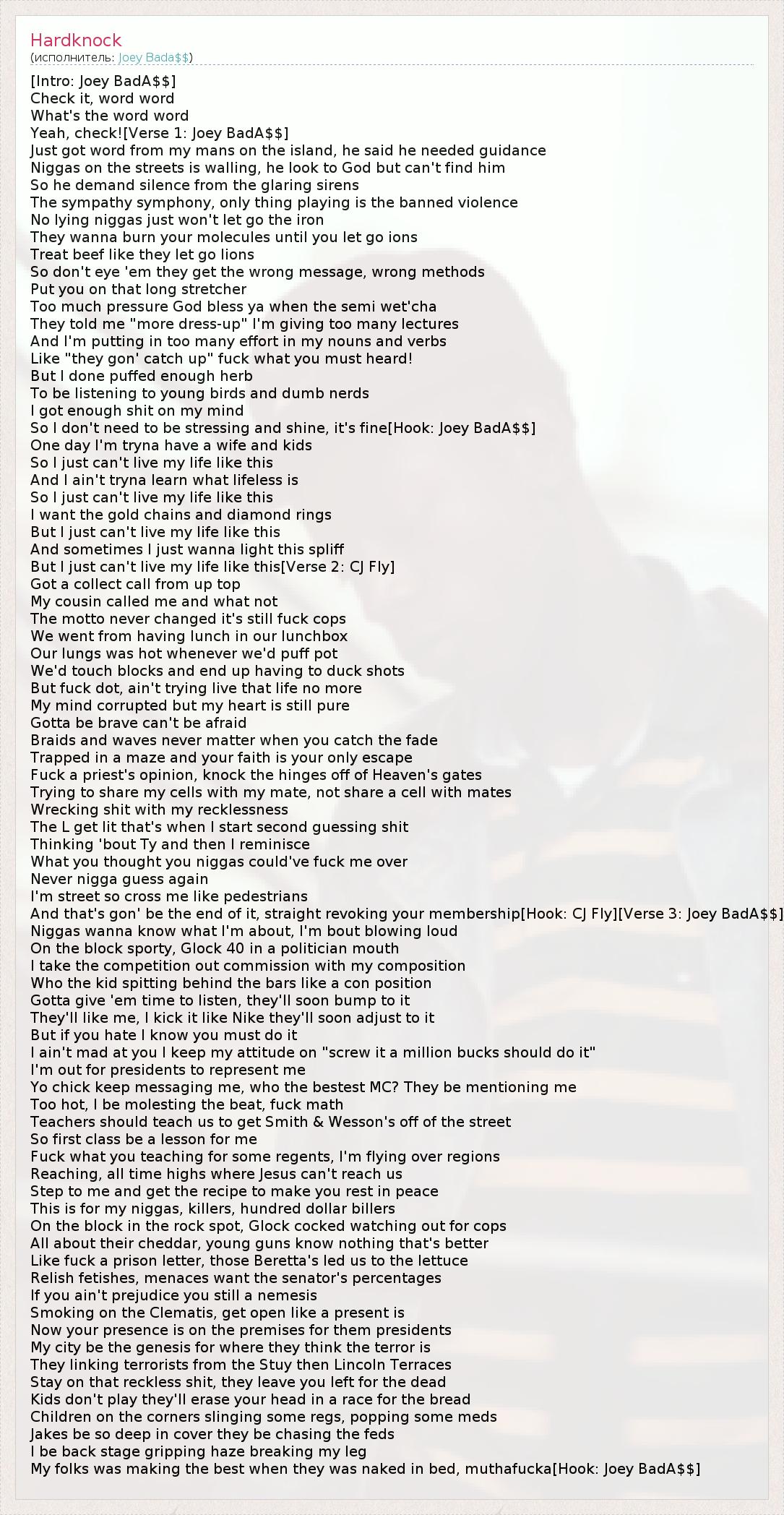 My folks was making the best when they was naked in bed, muthafucka[Hook: Joey BadA$$]