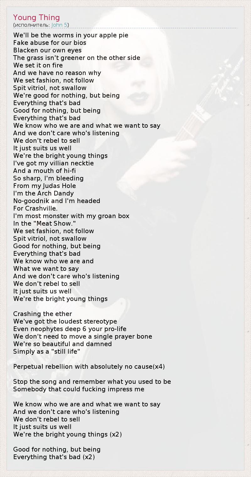 We'll be the worms in your apple pie Fake abuse for our bios Blacken our own eyes The grass isn't greener on the other side We set it on fire And we have no reason why We set fashion, not follow Spit vitriol, not swallow We're good for nothing, but being Everything that's bad Good for nothing, but being Everything that's bad We know who we are and what we want to say And we don't care who's listening We don't rebel to sell It just suits us well We're the bright young things I've got my villian necktie And a mouth of hi-fi So sharp, I'm bleeding From my Judas Hole I'm the Arch Dandy No-goodnik and I'm headed For Crashville. I'm most monster with my groan box In the "Meat Show." We set fashion, not follow Spit vitriol, not swallow Good for nothing, but being Everything that's bad We know who we are and What we want to say And we don't care who's listening We don't rebel to sell It just suits us well We're the bright young things Crashing the ether We've got the loudest stereotype Even neophytes deep 6 your pro-life We don't need to move a single prayer bone We're so beautiful and damned Simply as a "still life" Perpetual rebellion with absolutely no cause(x4) Stop the song and remember what you used to be Somebody that could fucking impress me We know who we are and what we want to say And we don't care who's listening We don't rebel to sell It just suits us well We're the bright young things (x2) Good for nothing, but being Everything that's bad (x2)