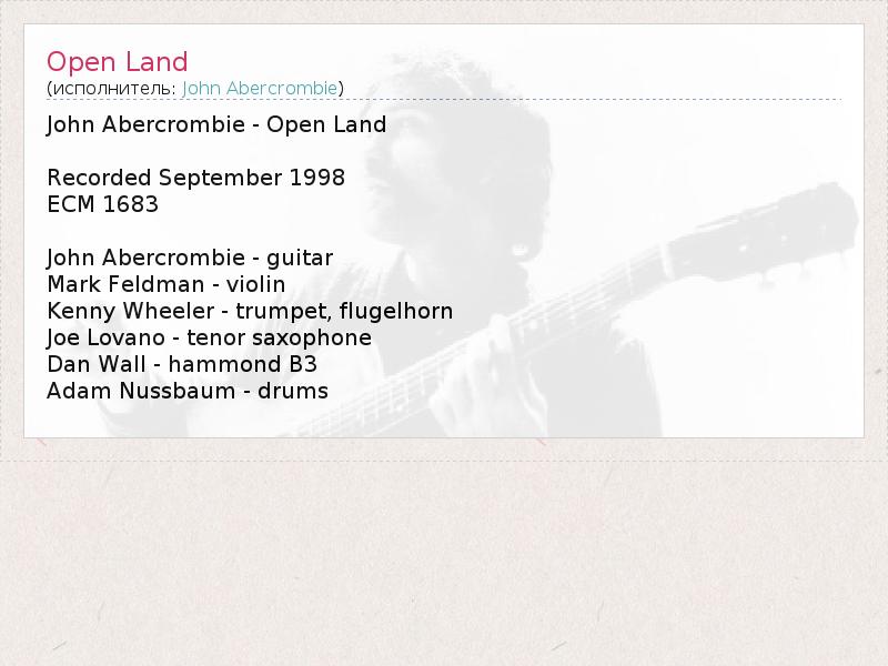 John Abercrombie - Open Land Recorded September 1998 ECM 1683 John Abercrombie - guitar Mark Feldman - violin Kenny Wheeler - trumpet, flugelhorn Joe Lovano - tenor saxophone Dan Wall - hammond B3 Adam Nussbaum - drums