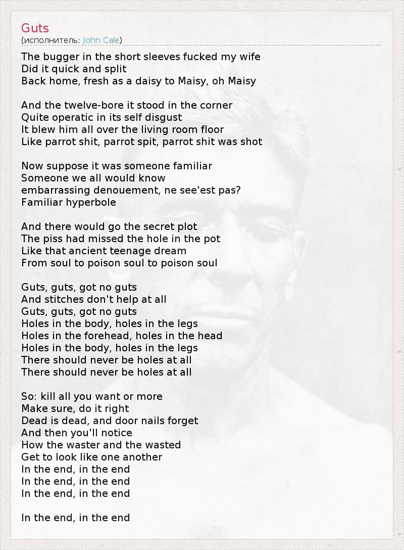 The bugger in the short sleeves fucked my wife Did it quick and split Back home, fresh as a daisy to Maisy, oh Maisy And the twelve-bore it stood in the corner Quite operatic in its self disgust It blew him all over the living room floor Like parrot shit, parrot spit, parrot shit was shot Now suppose it was someone familiar Someone we all would know embarrassing denouement, ne see'est pas? Familiar hyperbole And there would go the secret plot The piss had missed the hole in the pot Like that ancient teenage dream From soul to poison soul to poison soul Guts, guts, got no guts And stitches don't help at all Guts, guts, got no guts Holes in the body, holes in the legs Holes in the forehead, holes in the head Holes in the body, holes in the legs There should never be holes at all There should never be holes at all So: kill all you want or more Make sure, do it right Dead is dead, and door nails forget And then you'll notice How the waster and the wasted Get to look like one another In the end, in the end In the end, in the end In the end, in the end In the end, in the end