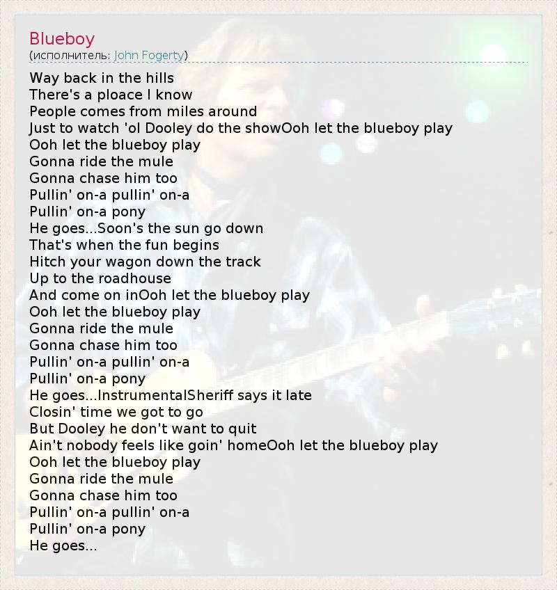 Way back in the hills There's a ploace I know People comes from miles around Just to watch 'ol Dooley do the showOoh let the blueboy play Ooh let the blueboy play Gonna ride the mule Gonna chase him too Pullin' on-a pullin' on-a Pullin' on-a pony He goes...Soon's the sun go down That's when the fun begins Hitch your wagon down the track Up to the roadhouse And come on inOoh let the blueboy play Ooh let the blueboy play Gonna ride the mule Gonna chase him too Pullin' on-a pullin' on-a Pullin' on-a pony He goes...InstrumentalSheriff says it late Closin' time we got to go But Dooley he don't want to quit Ain't nobody feels like goin' homeOoh let the blueboy play Ooh let the blueboy play Gonna ride the mule Gonna chase him too Pullin' on-a pullin' on-a Pullin' on-a pony He goes...