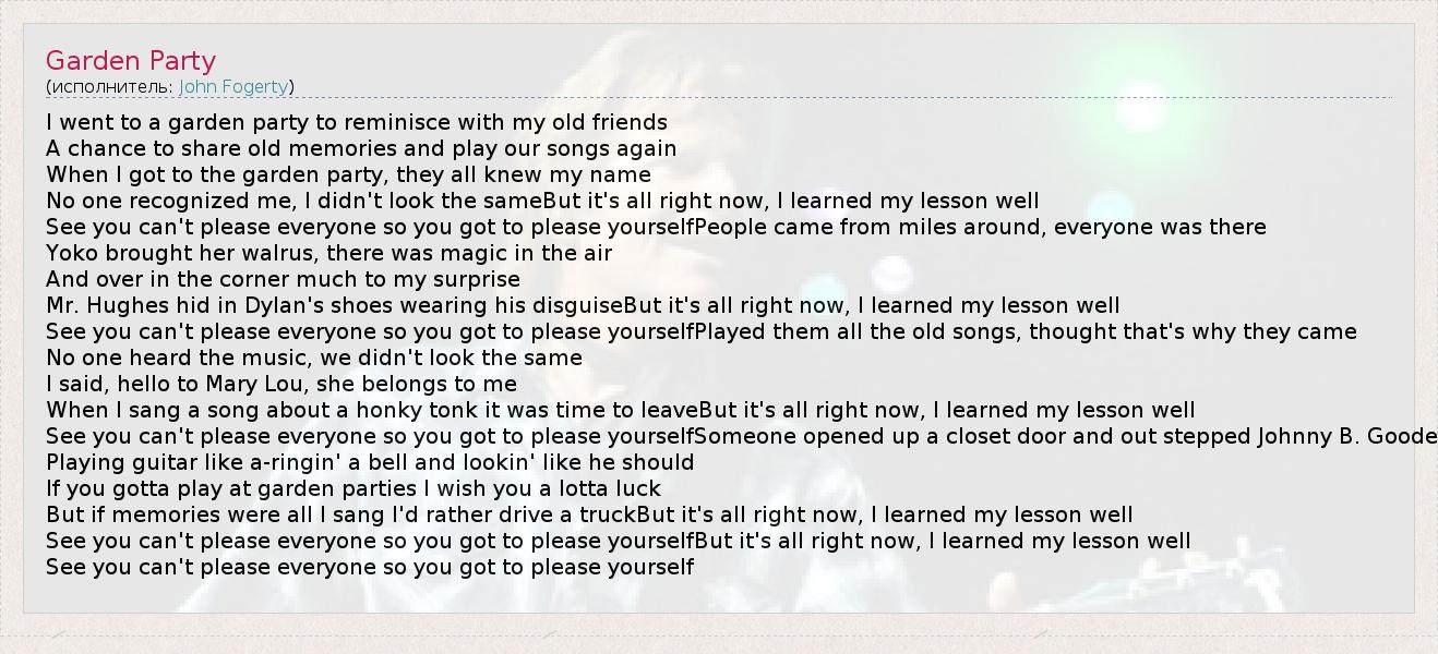 I went to a garden party to reminisce with my old friends A chance to share old memories and play our songs again When I got to the garden party, they all knew my name No one recognized me, I didn't look the sameBut it's all right now, I learned my lesson well See you can't please everyone so you got to please yourselfPeople came from miles around, everyone was there Yoko brought her walrus, there was magic in the air And over in the corner much to my surprise Mr. Hughes hid in Dylan's shoes wearing his disguiseBut it's all right now, I learned my lesson well See you can't please everyone so you got to please yourselfPlayed them all the old songs, thought that's why they came No one heard the music, we didn't look the same I said, hello to Mary Lou, she belongs to me When I sang a song about a honky tonk it was time to leaveBut it's all right now, I learned my lesson well See you can't please everyone so you got to please yourselfSomeone opened up a closet door and out stepped Johnny B. Goode Playing guitar like a-ringin' a bell and lookin' like he should If you gotta play at garden parties I wish you a lotta luck But if memories were all I sang I'd rather drive a truckBut it's all right now, I learned my lesson well See you can't please everyone so you got to please yourselfBut it's all right now, I learned my lesson well See you can't please everyone so you got to please yourself