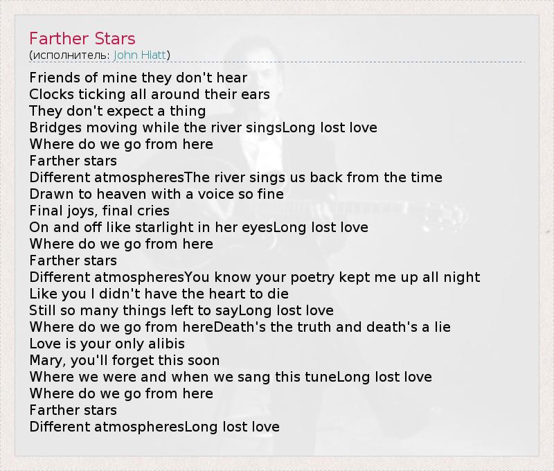 Friends of mine they don't hear Clocks ticking all around their ears They don't expect a thing Bridges moving while the river singsLong lost love Where do we go from here Farther stars Different atmospheresThe river sings us back from the time Drawn to heaven with a voice so fine Final joys, final cries On and off like starlight in her eyesLong lost love Where do we go from here Farther stars Different atmospheresYou know your poetry kept me up all night Like you I didn't have the heart to die Still so many things left to sayLong lost love Where do we go from hereDeath's the truth and death's a lie Love is your only alibis Mary, you'll forget this soon Where we were and when we sang this tuneLong lost love Where do we go from here Farther stars Different atmospheresLong lost love